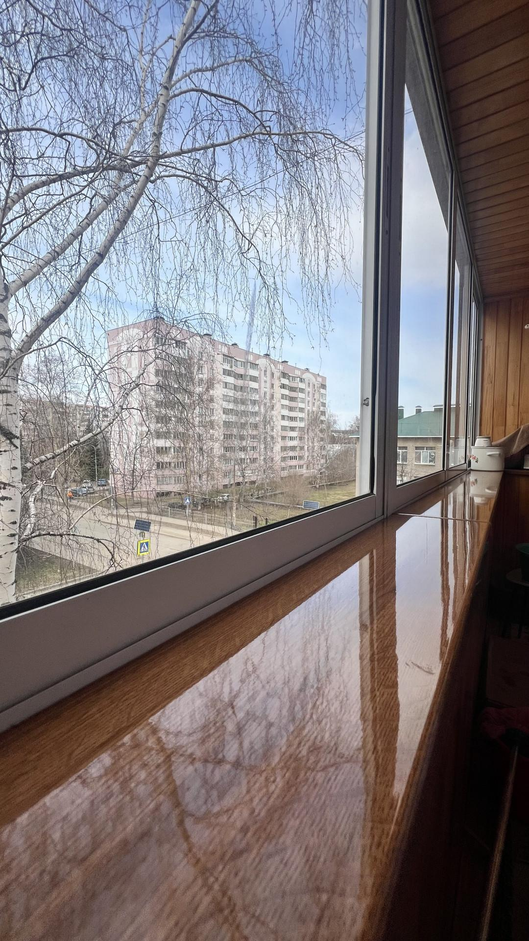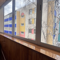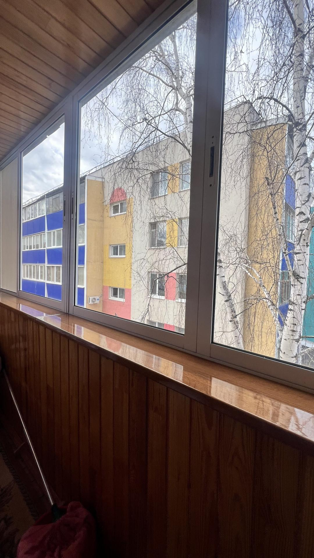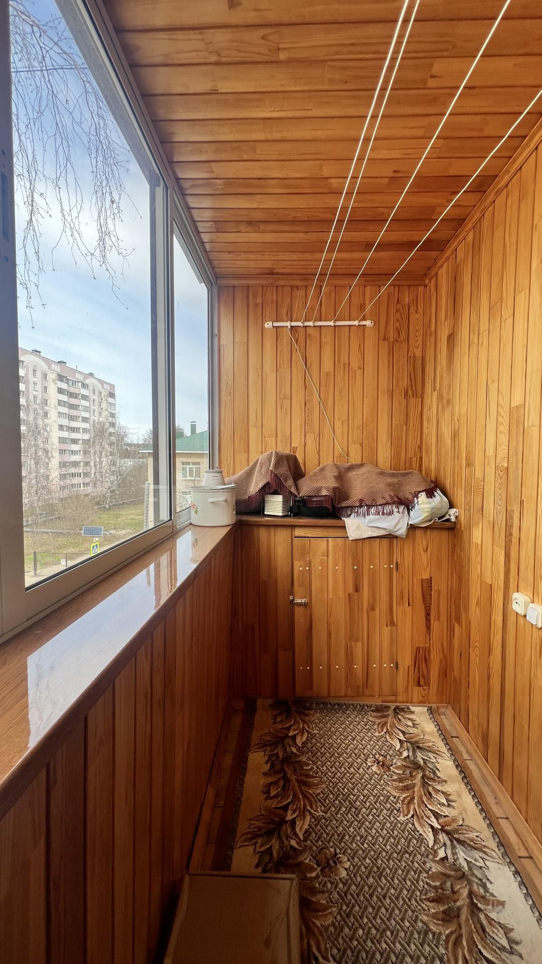 Застекленная пластиковыми окнами, обшитая деревом лоджия.