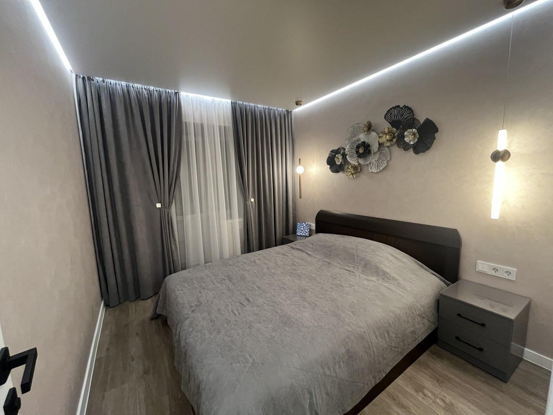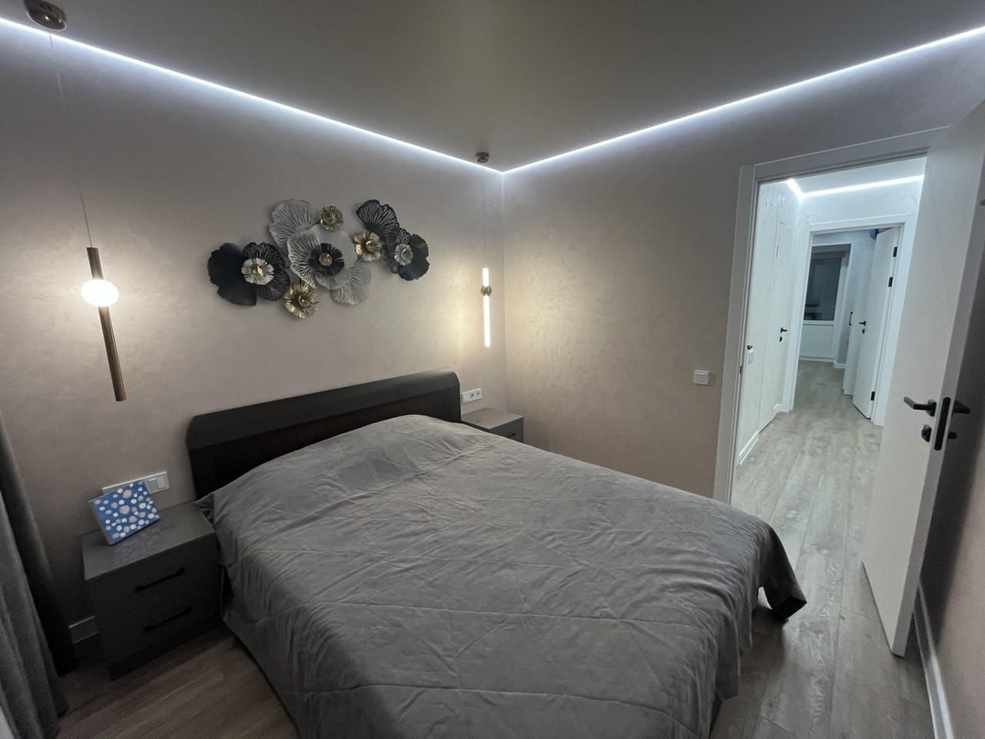 Электрика вся заменена. В спальне и детской комнате сделан Дизайнерский ремонт. Стены все идеально выровнены. Покрытие - декоративная штукатурка. Потолки натяжные - теневые с подстветкой. Полы - кварцвинил.