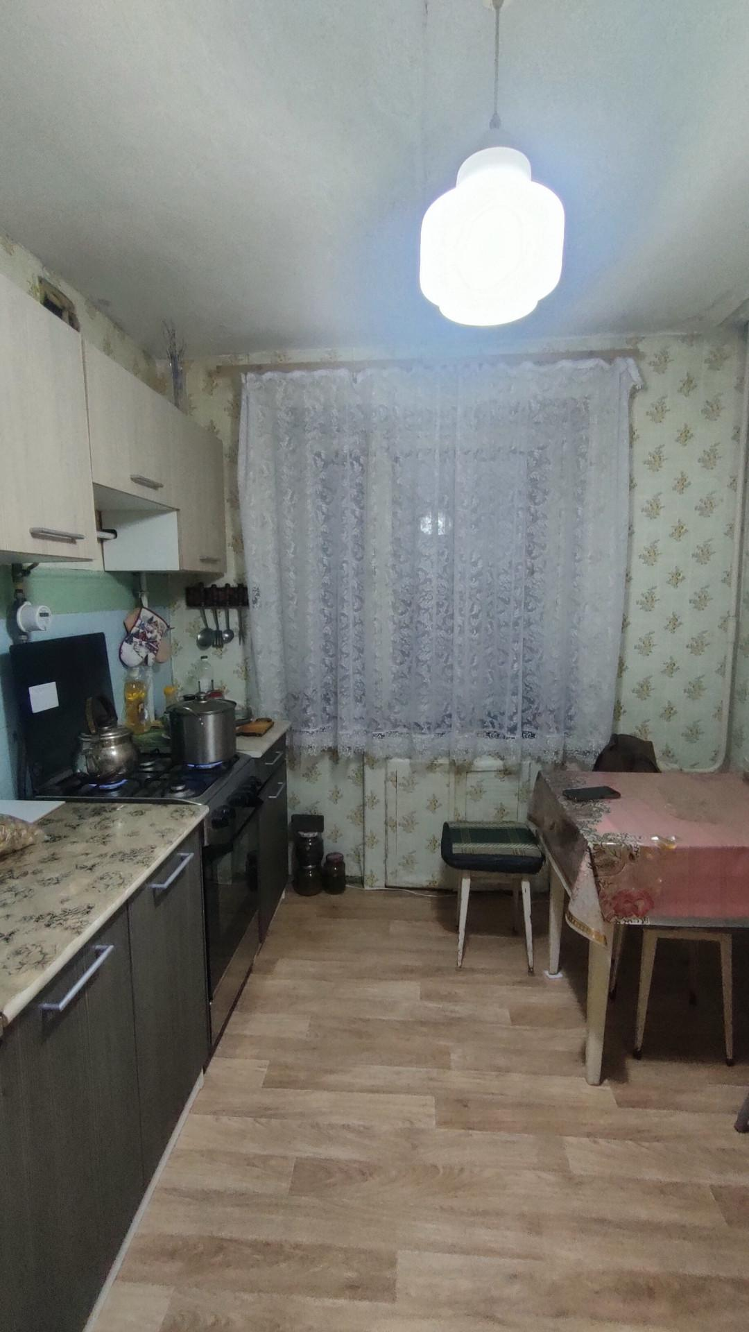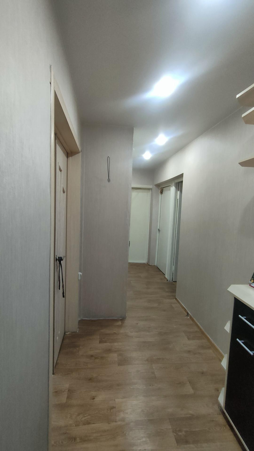 Кухня прямоугольной формы, тоже вместительная 9 кв.м., окно на кухне деревянная. Остальные по всей квартире пластиковые. Натяжной потолок в прихожей и в зале.