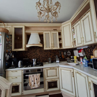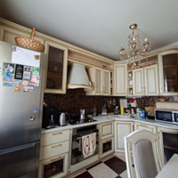 - Кухня из натурального дерева — настоящая изюминка квартиры! В комплекте остаются духовой шкаф, посудомоечная машина и столовая группа.