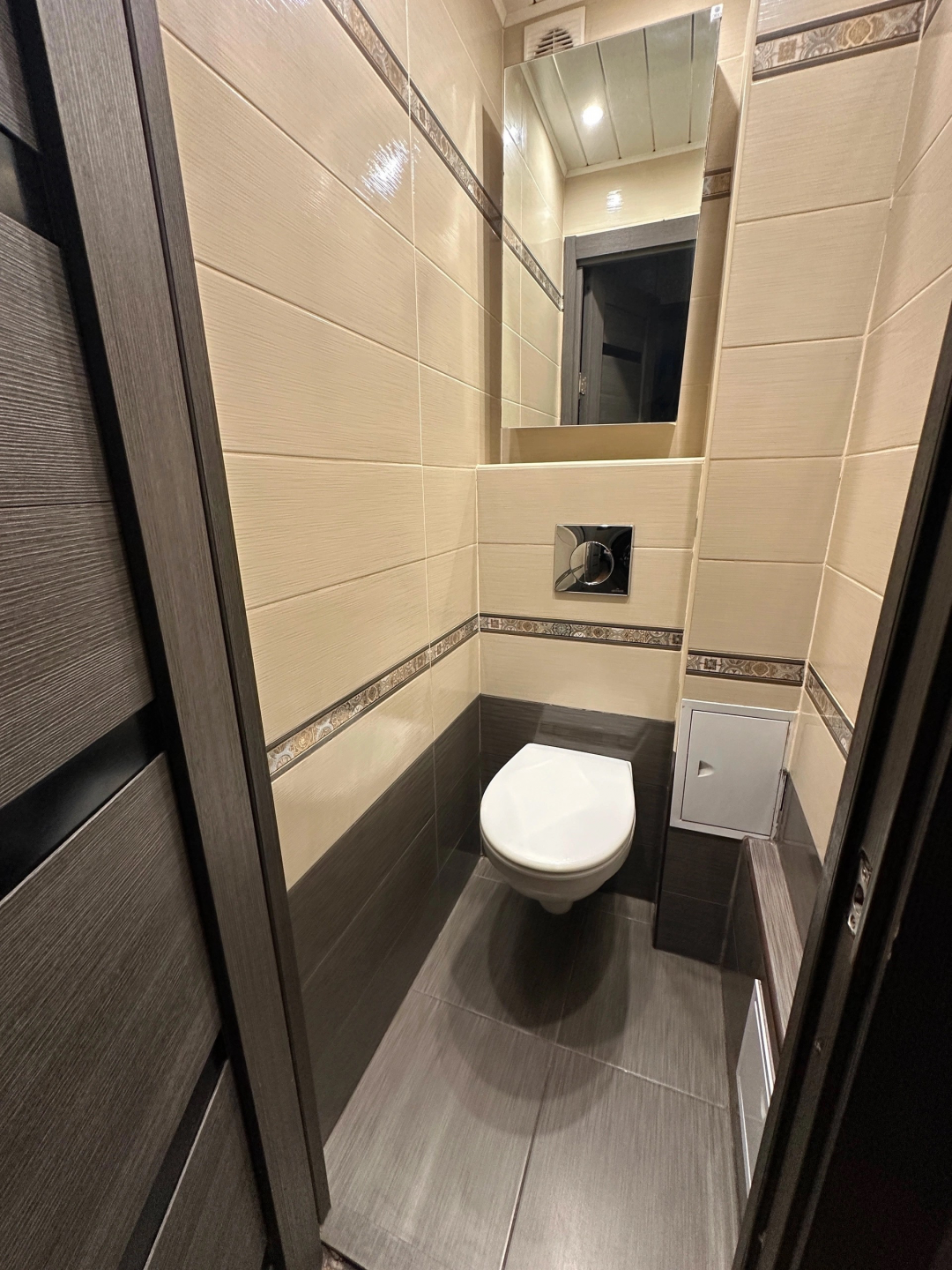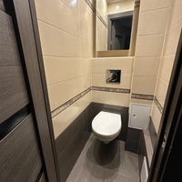 Раздельный санузел облицован современным кафелем, установлена инсталляция.