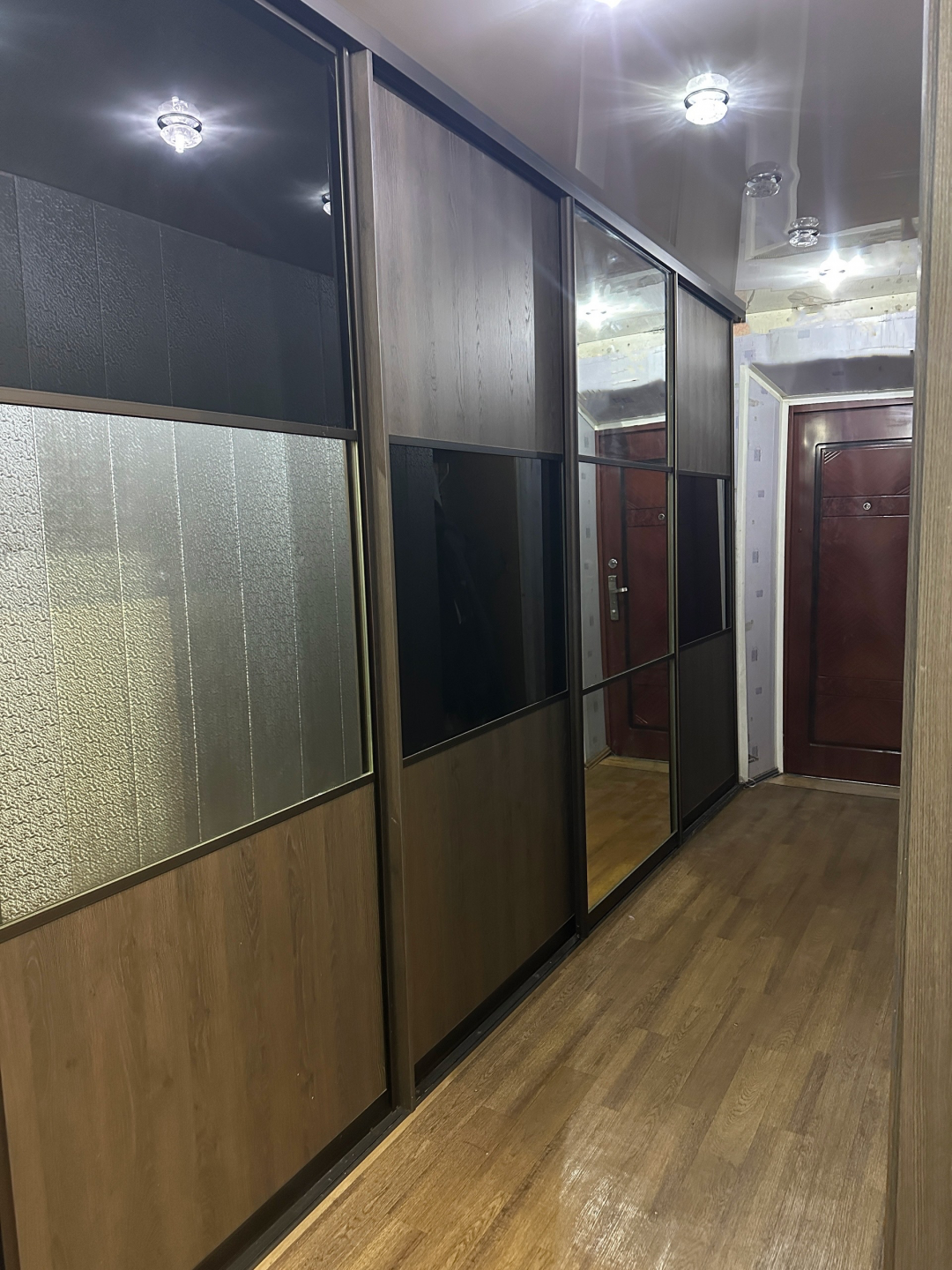 Натяжные потолки в зале, кухне, коридоре и одной из комнат.