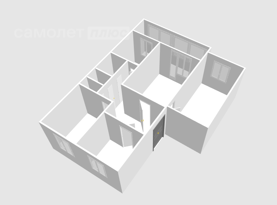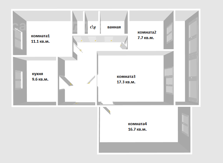 В квартире:Три изолированные комнаты площадью 16.7, 7.7 и 11.1 кв. м. соответственно и одна смежная 17.3 кв.м.;Кухня - 9.6 кв. м.;Просторный коридор - 11.6 кв. м.;кладовая и раздельный с/у.; Так же имеется большая лоджия 5.8 кв.м..