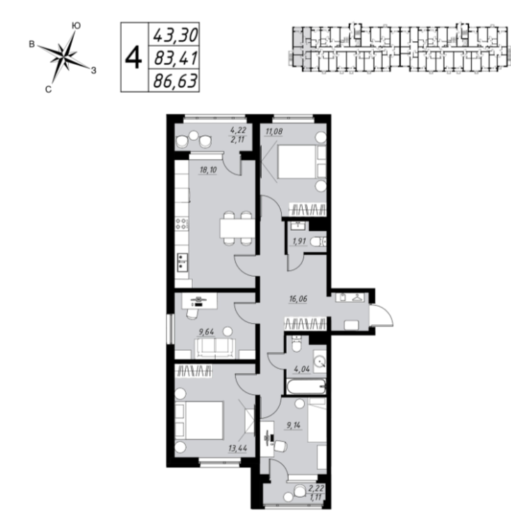 Большим преимуществом является большая кухня-гостиная 18,1 м² с выходом на остекленную лоджию, комната 1: 13,44 м², комната 2: 11,08 м², комната 3: 9,14 м², комната 4: 9,64 м², прихожая: 16,06 м², санузел: 4,04 м², санузел 2: 1,91 м², лоджия: 2,11 м², лоджия 2: 1,11 м²