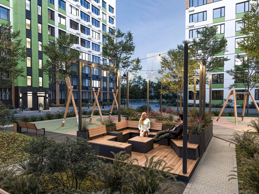 Прекрасное озеленение территории - то, что нужно для отдыха и прогулок. Комфортные лавочки, стильные беседки и зелёные насаждения создают атмосферу уюта и спокойствия. Идеальное место, чтобы расслабиться после рабочего дня в окружении природы!
