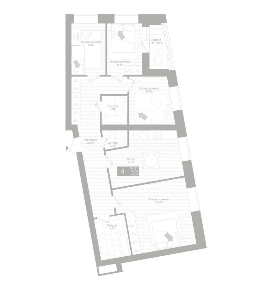 Располагается на третьем этаже девятиэтажного кирпичного дома. Лоджия застекленная. Предчистовая отделка со всеми коммуникациями. Три санузла, мастер-спальня площадью 20 кв.м, просторная кухня-гостиная.