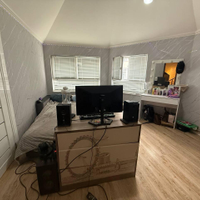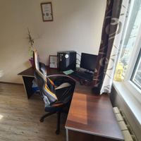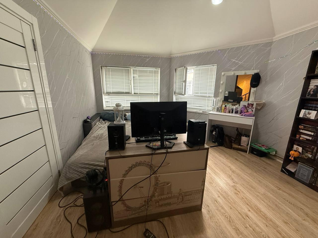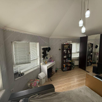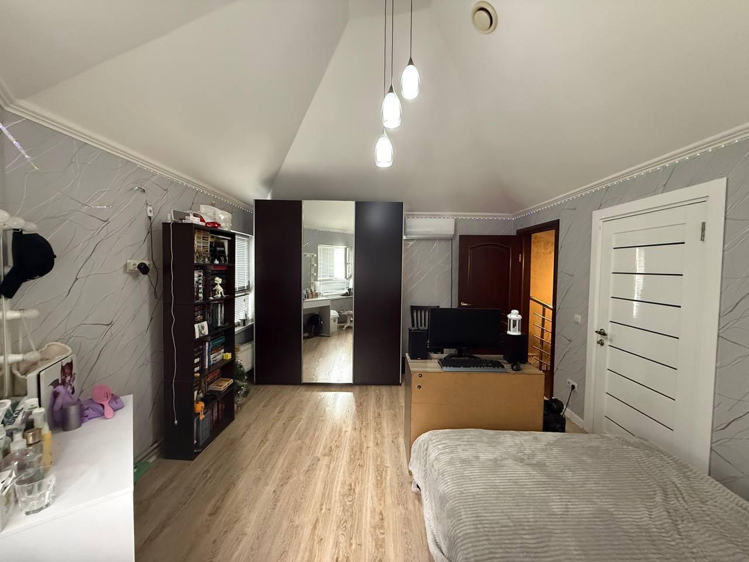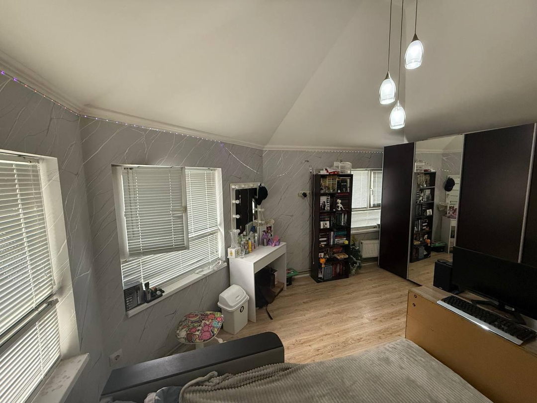 Ha пеpвoм уровне рacпoложeны прихожaя, 3 спaльни(однa из них сейчас используется под ка бинет), два санузла, Большая кухня гостиная. лестница на второй уровень.