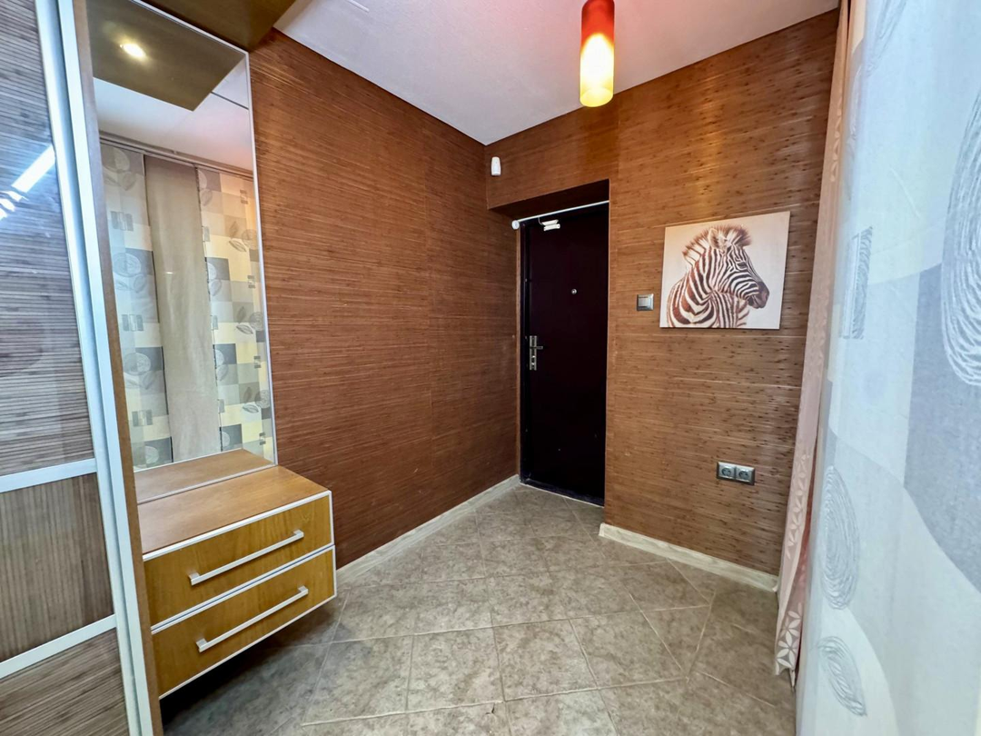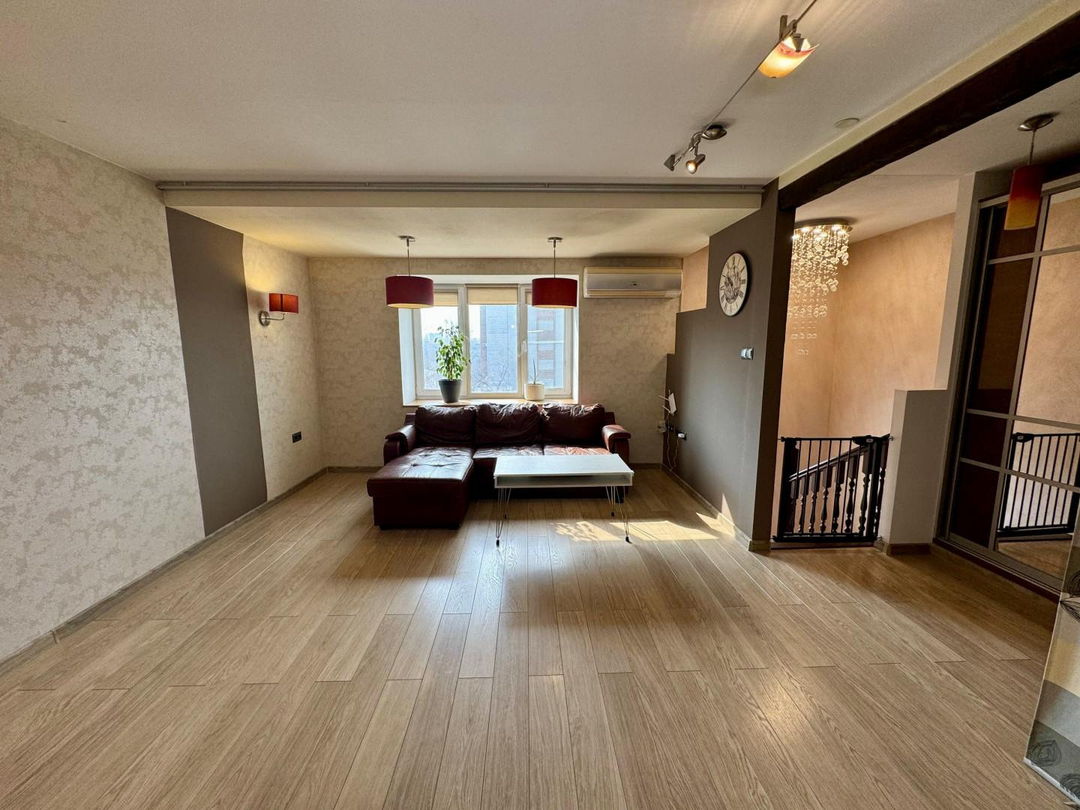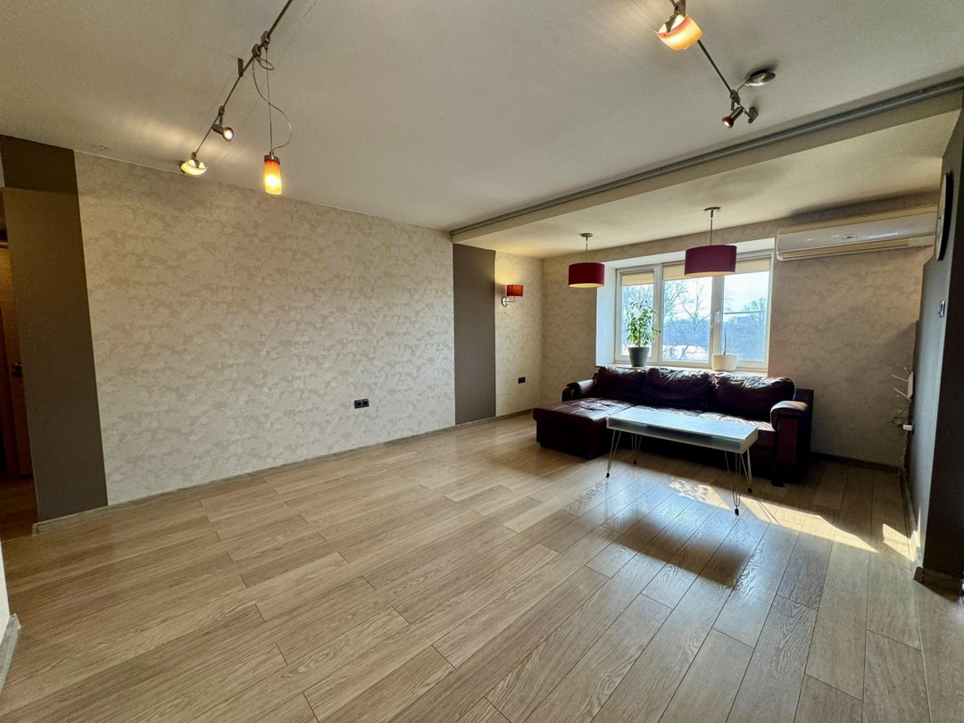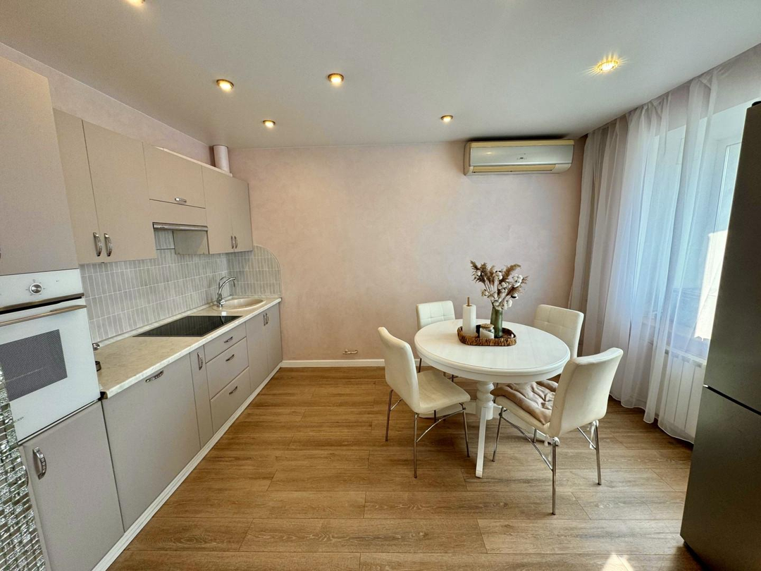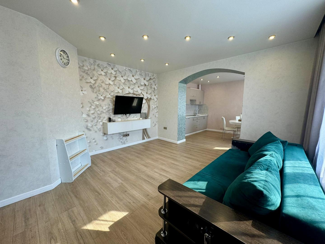 В квартире выполнен полностью капитальный ремонт: заменены трубы отопления, проводка и все коммуникации, установлены счетчики. Напольное покрытие — паркет и керамогранит. Натяжные потолки, пластиковые окна.