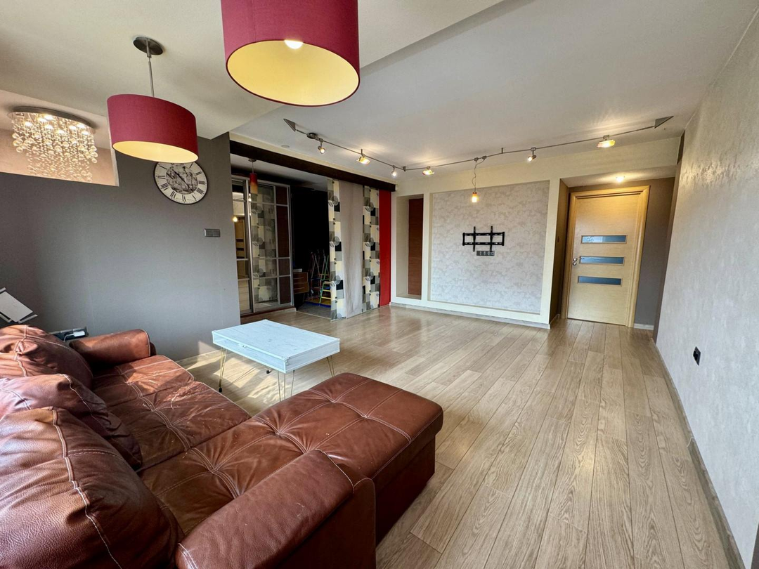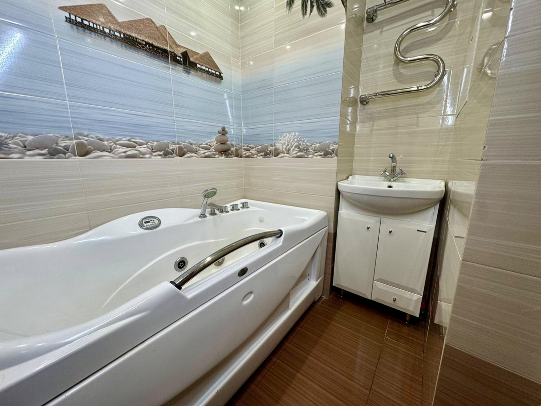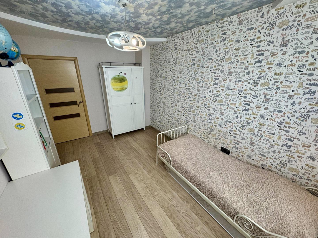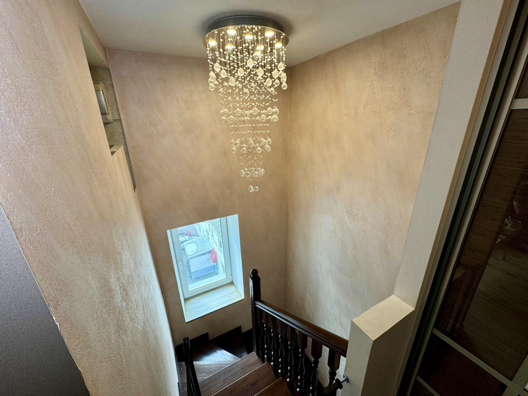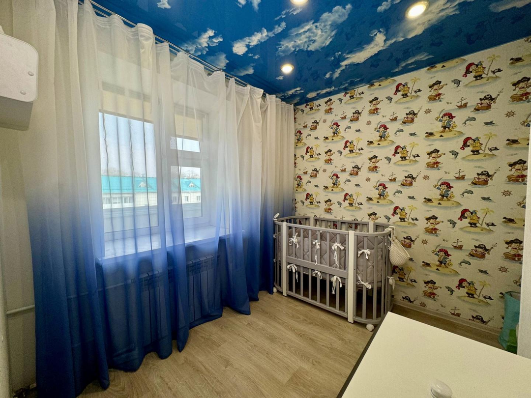 В квартире выполнен полностью капитальный ремонт: заменены трубы отопления, проводка и все коммуникации, установлены счетчики. Напольное покрытие — паркет и керамогранит. Натяжные потолки, пластиковые окна.