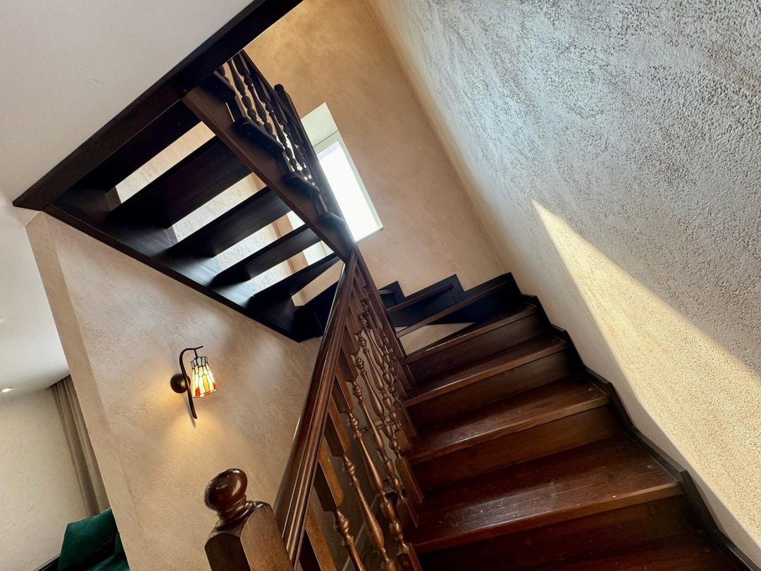 Продуманная планировка: первый этаж занимает просторная кухня-гостиная, а самое интересное наверху. На втором этаже расположены зал, спальня, раздельный санузел, две детские комнаты и огромная лоджия.
