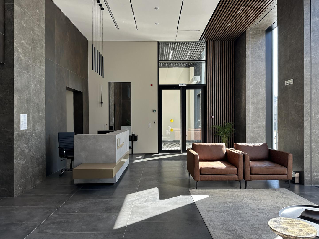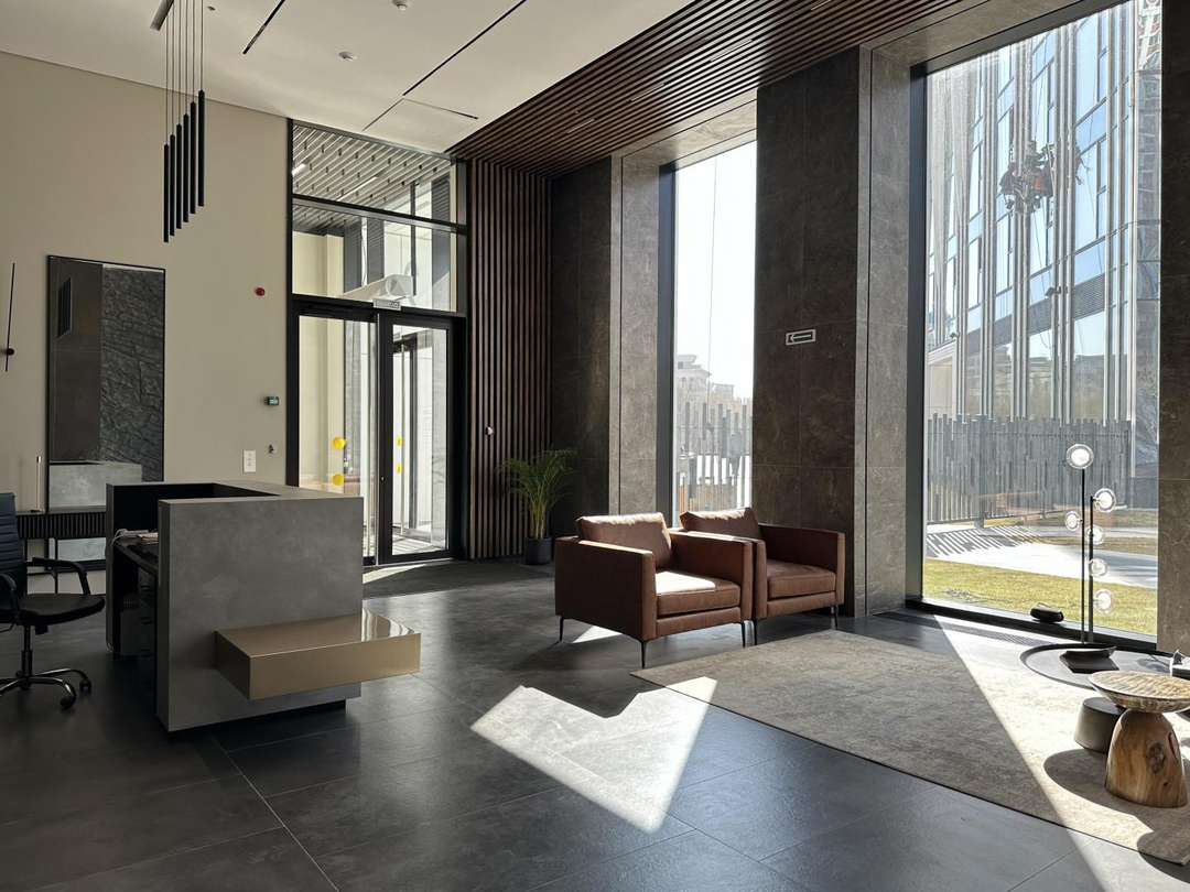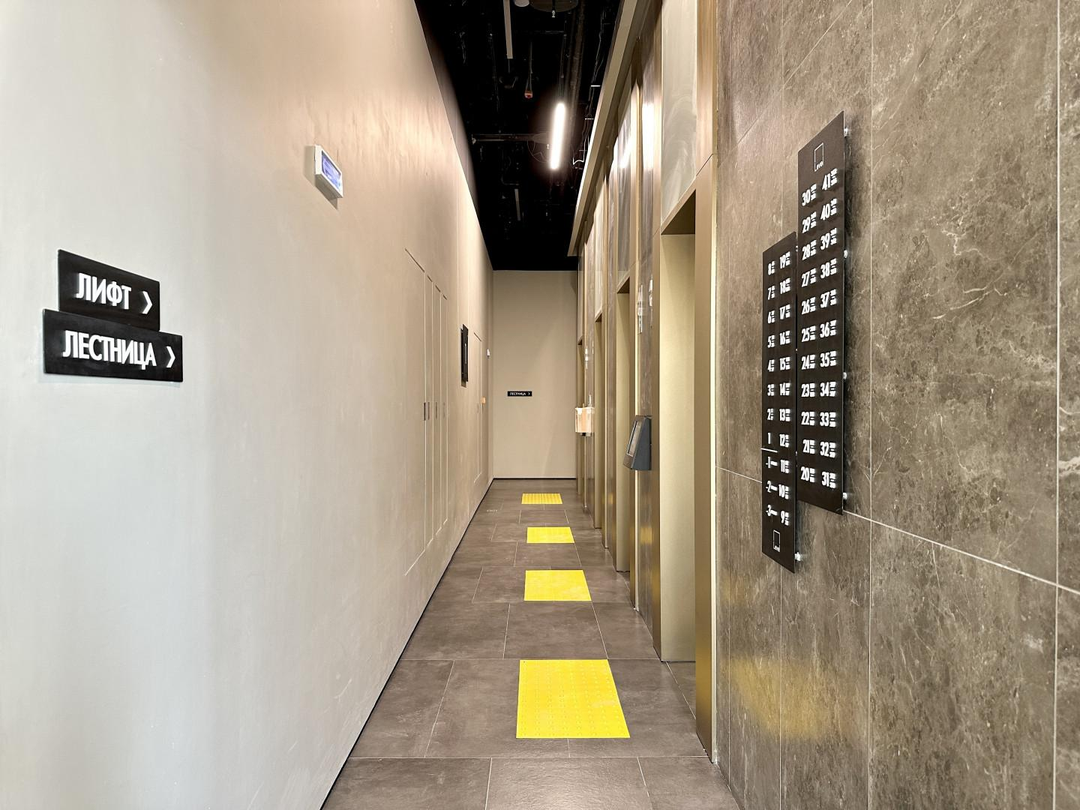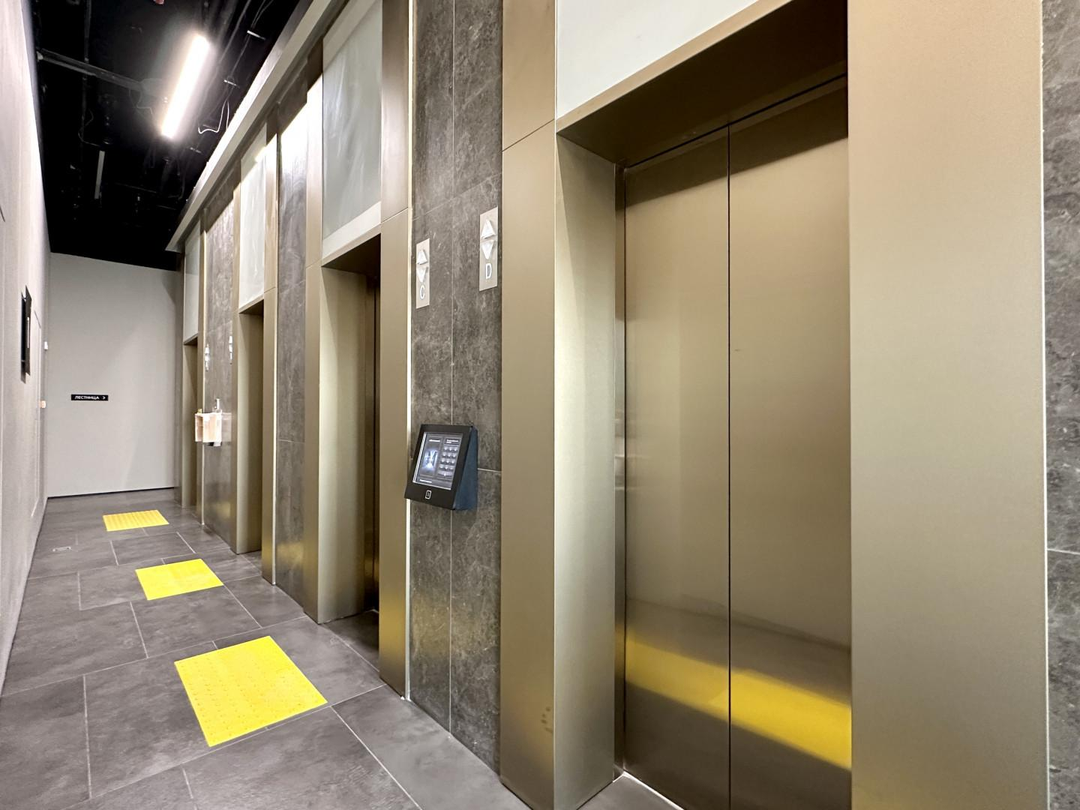 двумя пассажирскими и двумя грузовыми лифтами. Подземный паркинг. На первом этаже круглосуточная охрана. Лобби с консьержом.