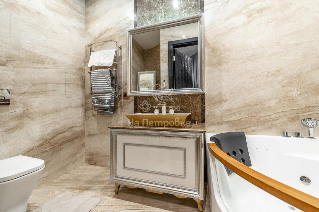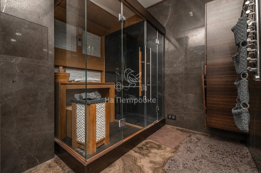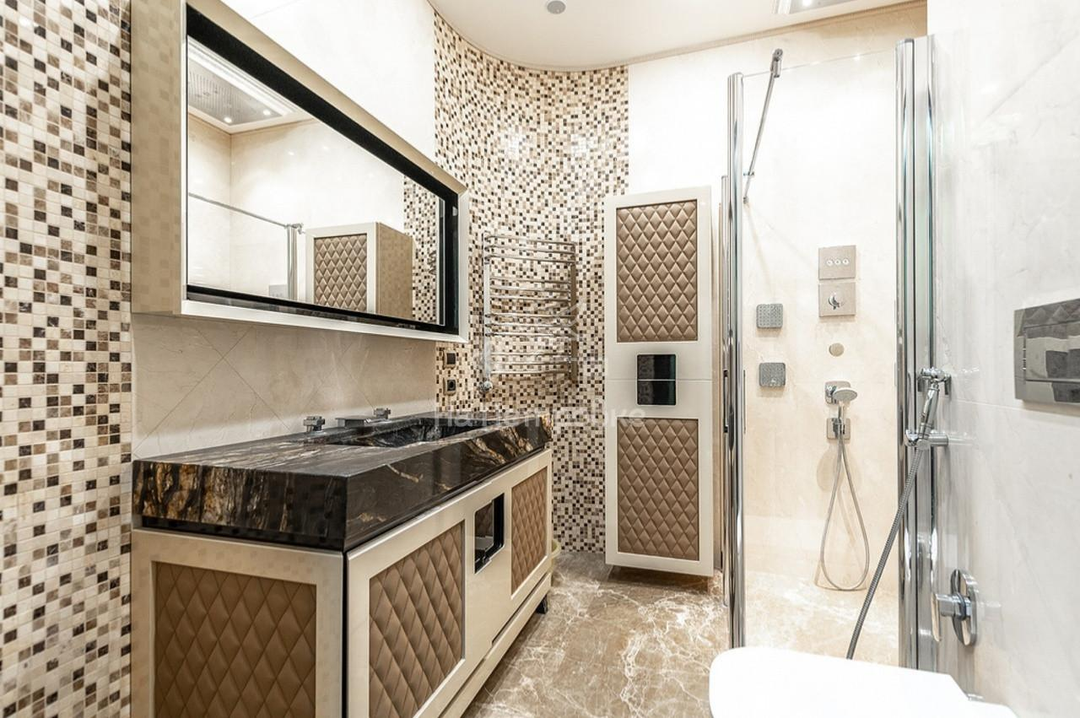Три ванные комнаты как произведения искусств, природная цветовая гамма мрамора и камня как картина известного художника не оставят Вас равнодушными. Для ценителей есть сауна.
