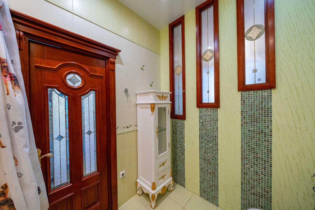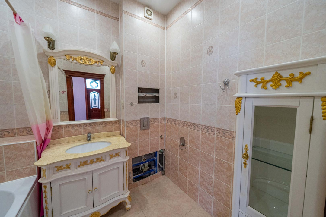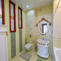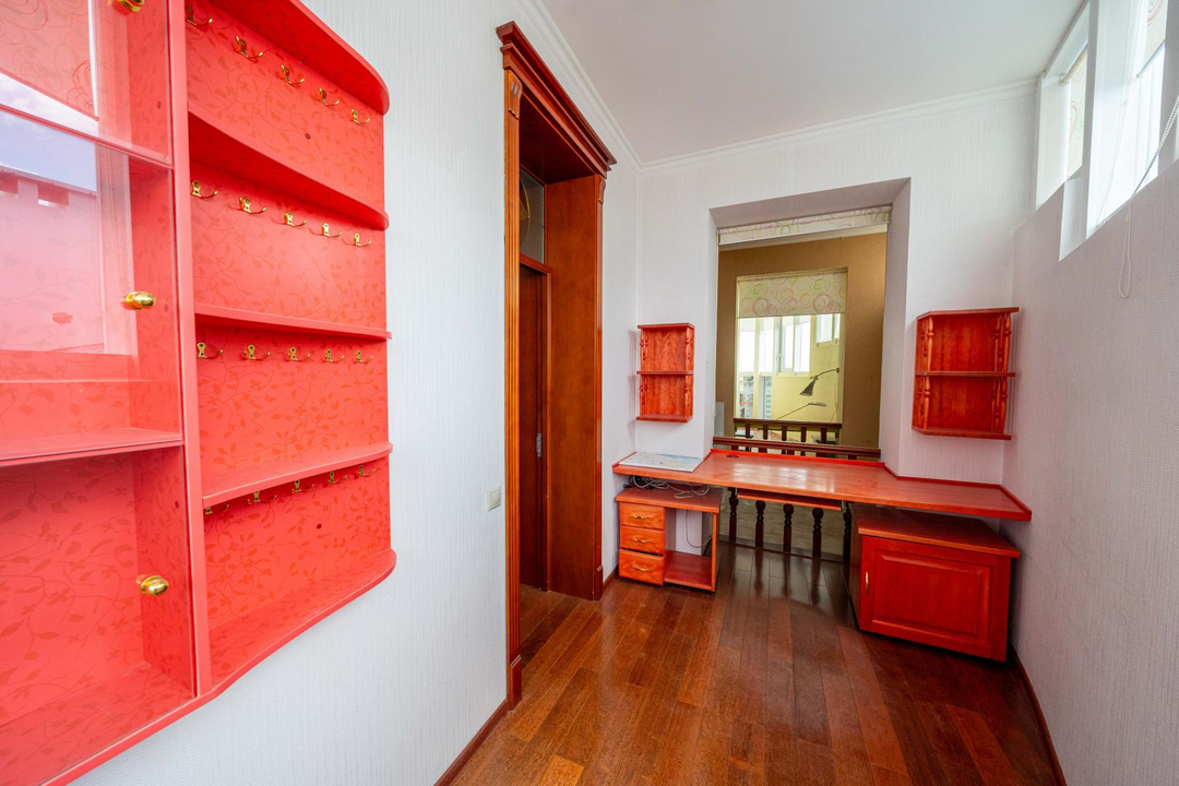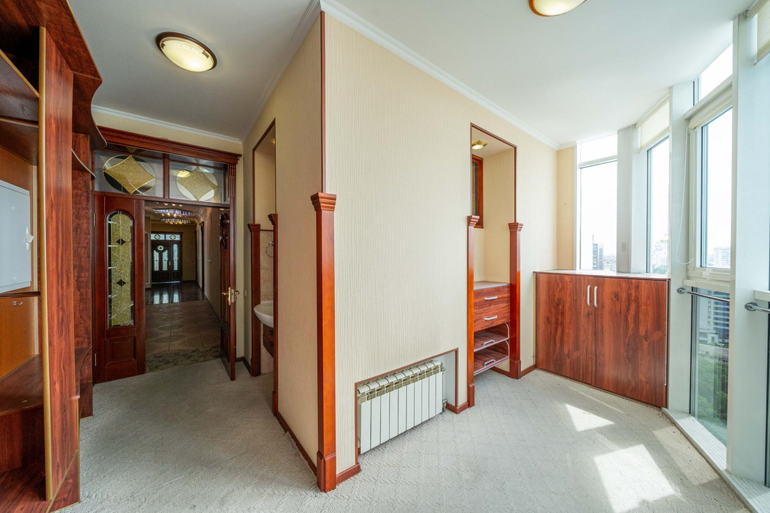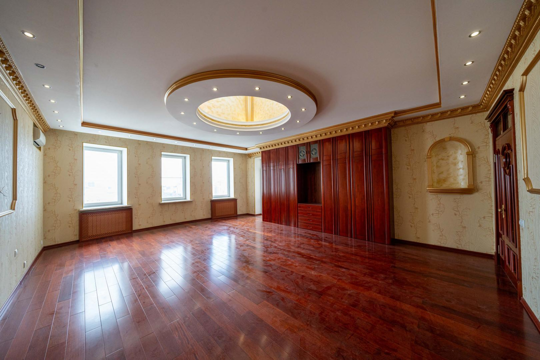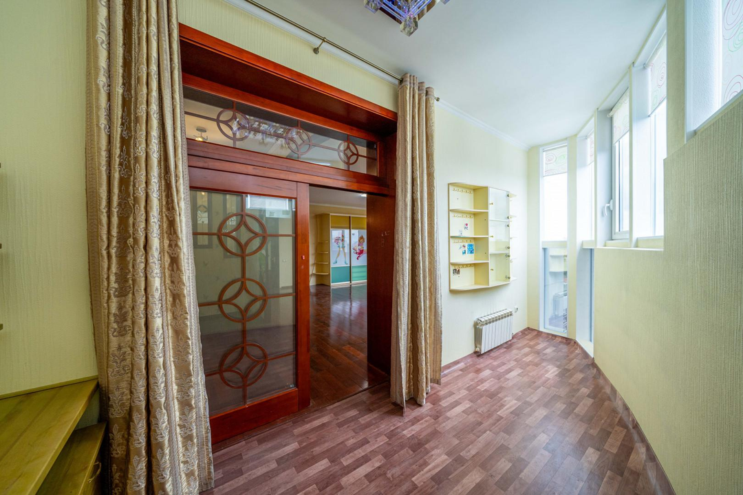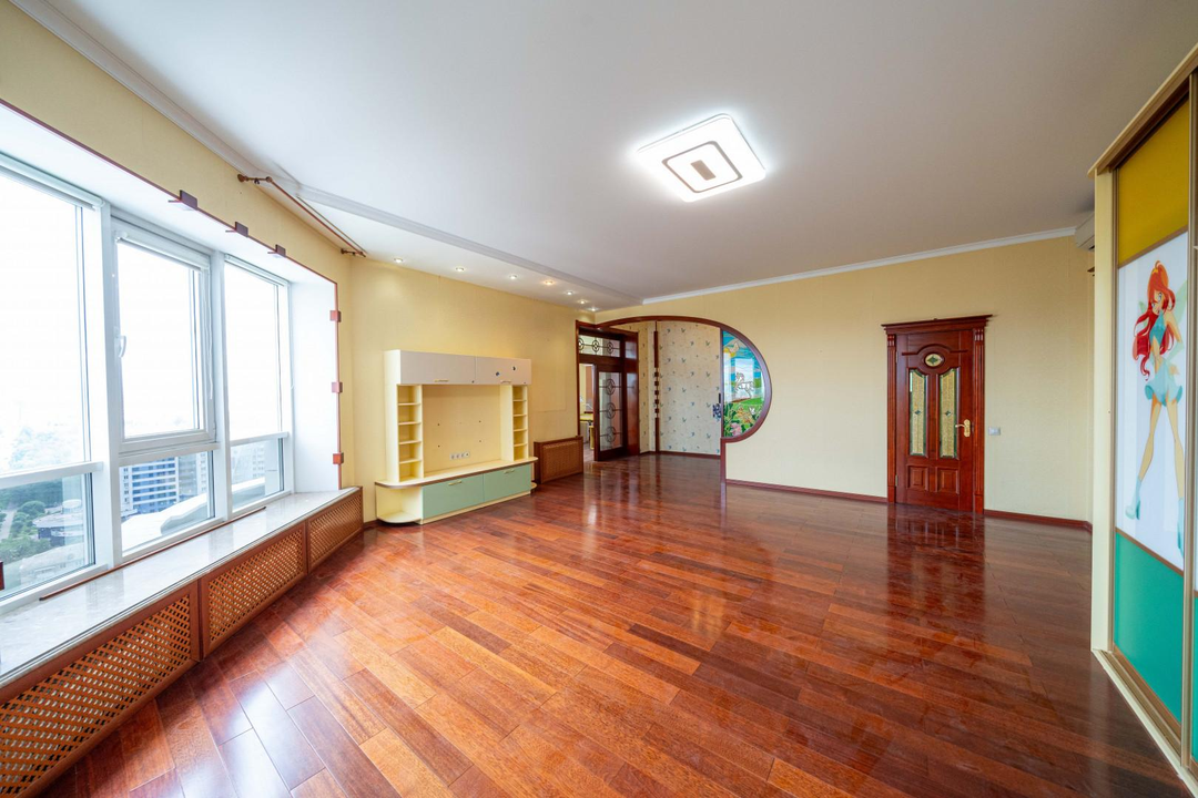 Много мест для хранения, современный большой зал со сценической площадкой, подсветкой и декоративной иллюминацией (идеальное место для деловых встреч, переговоров, тренингов, мероприятий, занятий спортом, танцами). Кухня-гостиная, большая комната со встроенной купольной конструкцией и гардеробной из натурального дерева, 2 детских комнаты со спальнями; вместительная прихожая, которая выходит в светлую гардеробную-лоджию, 3 санузла, раковина в прихожей, 6 лоджий, установлены кондиционеры.
