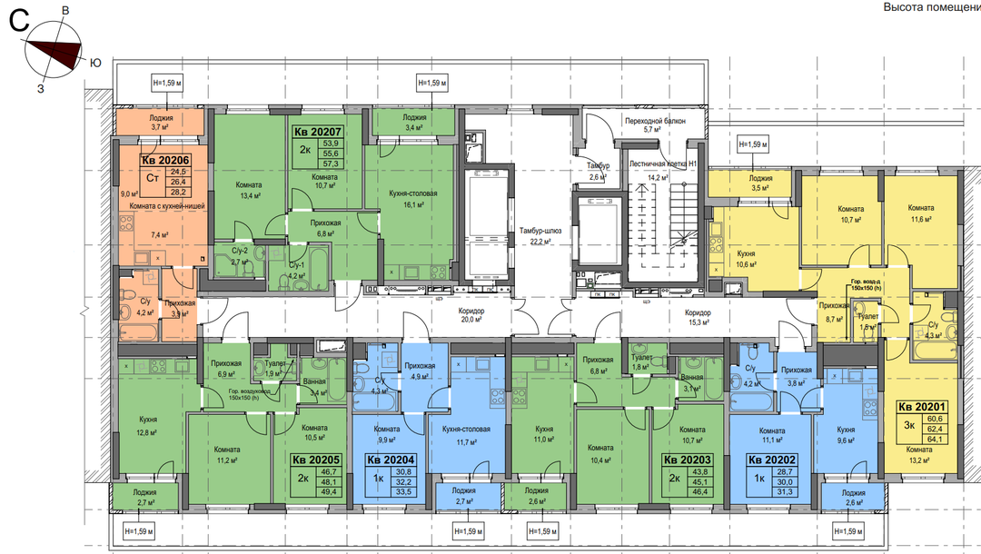 3-к. квартира, 62 м²