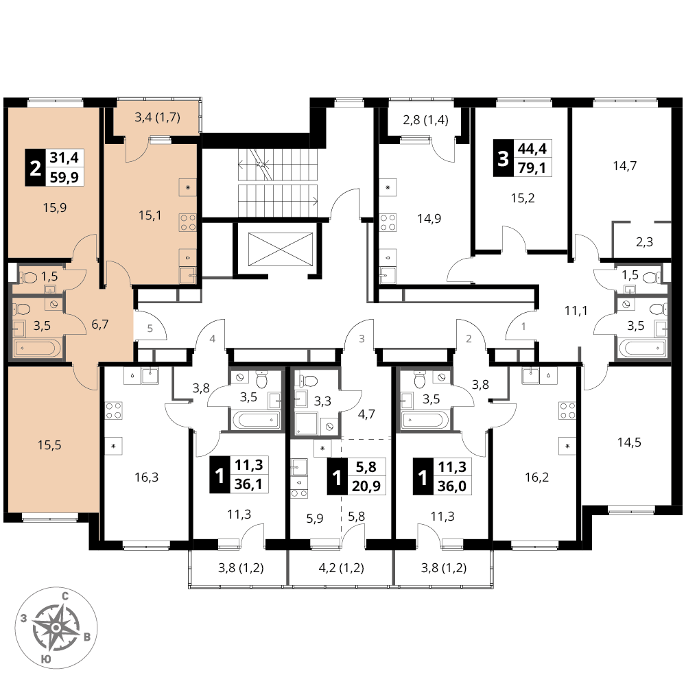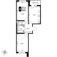 2-к. квартира, 59 м²
