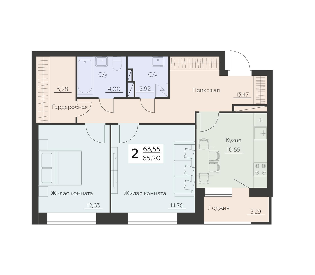 2-к. квартира, 65 м²