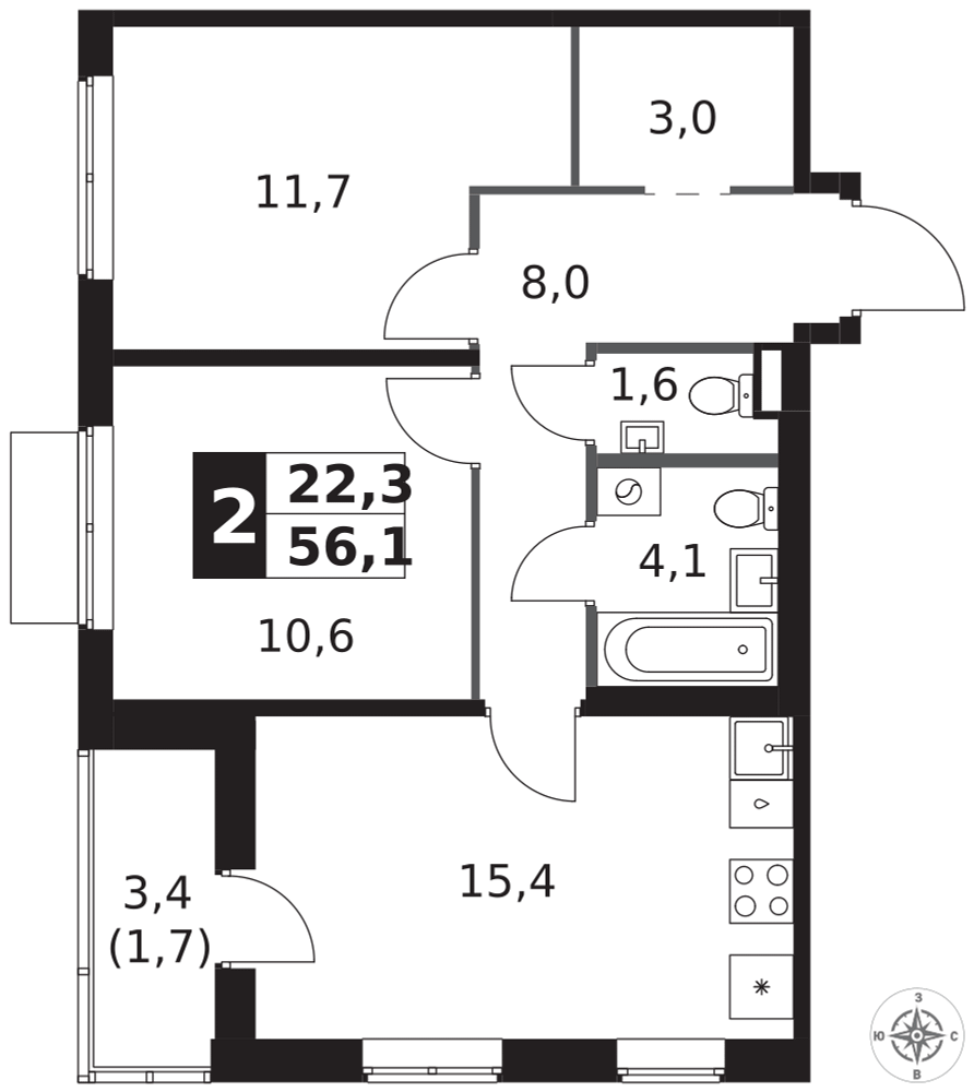 2-к. квартира, 56 м²