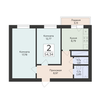 2-к. квартира, 54 м²