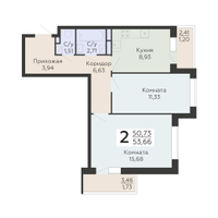 2-к. квартира, 53 м²