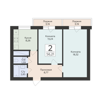 2-к. квартира, 56 м²