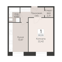 1-к. квартира, 50 м²