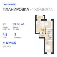 1-к. квартира, 62 м²