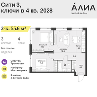 2-к. квартира, 55 м²