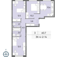 3-к. квартира, 60 м²