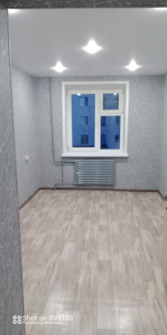 Новое большое пластиковое окно, двери, напольное покрытие, натяжные потолки, обои светло-серых оттенков