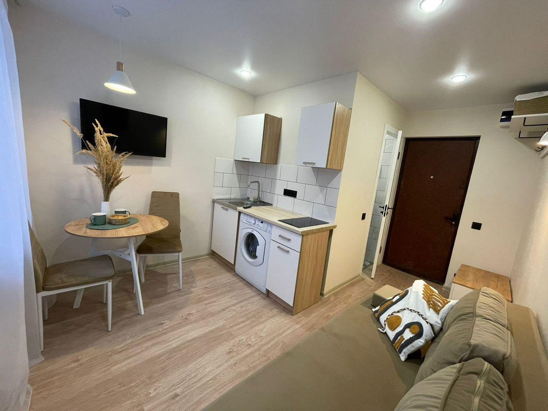 Кухонная зона продумана до мелочей: здесь есть все для кулинарных шедевров, а уютный диван с телевизором создадут идеальное место для отдыха и релаксации.