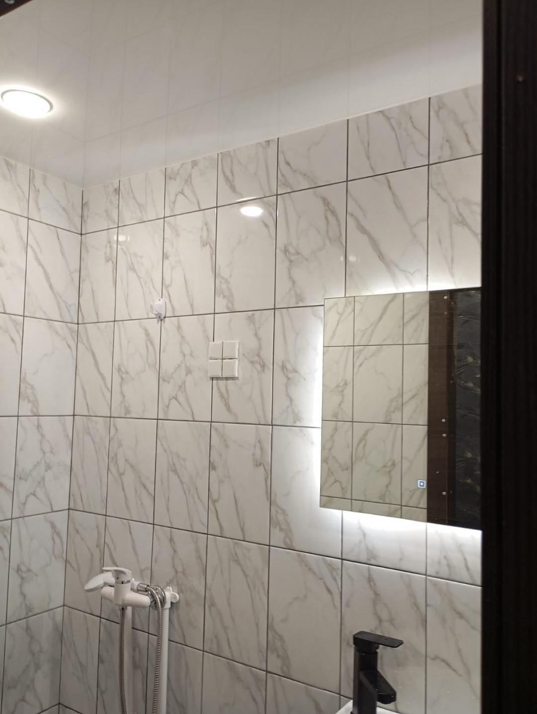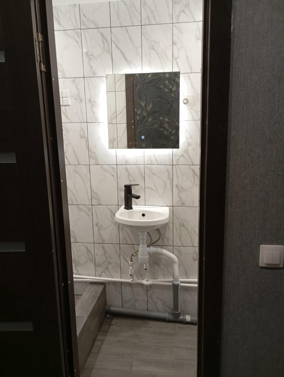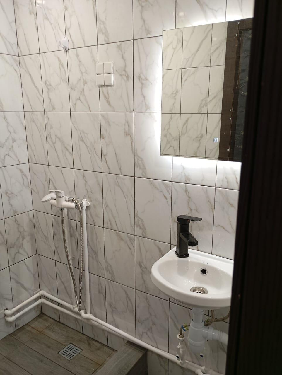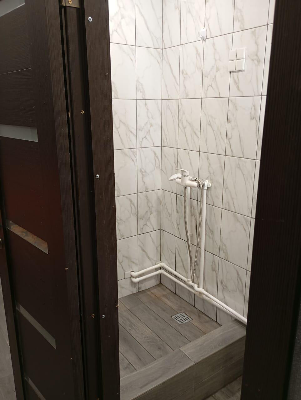 Ванна с туалетом выложена современной плиткой. Низкие коммунальные платежи.