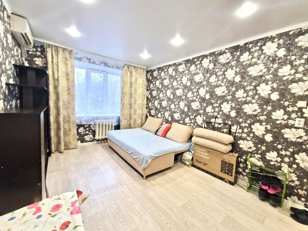 Светлая и просторная, с косметическим ремонтом и необходимой мебелью. Состояние квартиры - заходи и живи! Параметры комнаты 3,2м х 5,4 м. Установлено трехстворчатое пластиковое окно. В комнате натяжной потолок со встроенными светильниками.