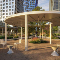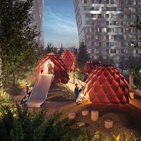 Благоустройство территорииЗакрытый двор-парк от бюро Gafa площадью 2 га с озеленением (45% территории), детские и спортивные площадки, амфитеатр. «Река», наполняемая дождевой водой.