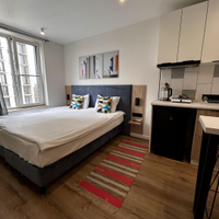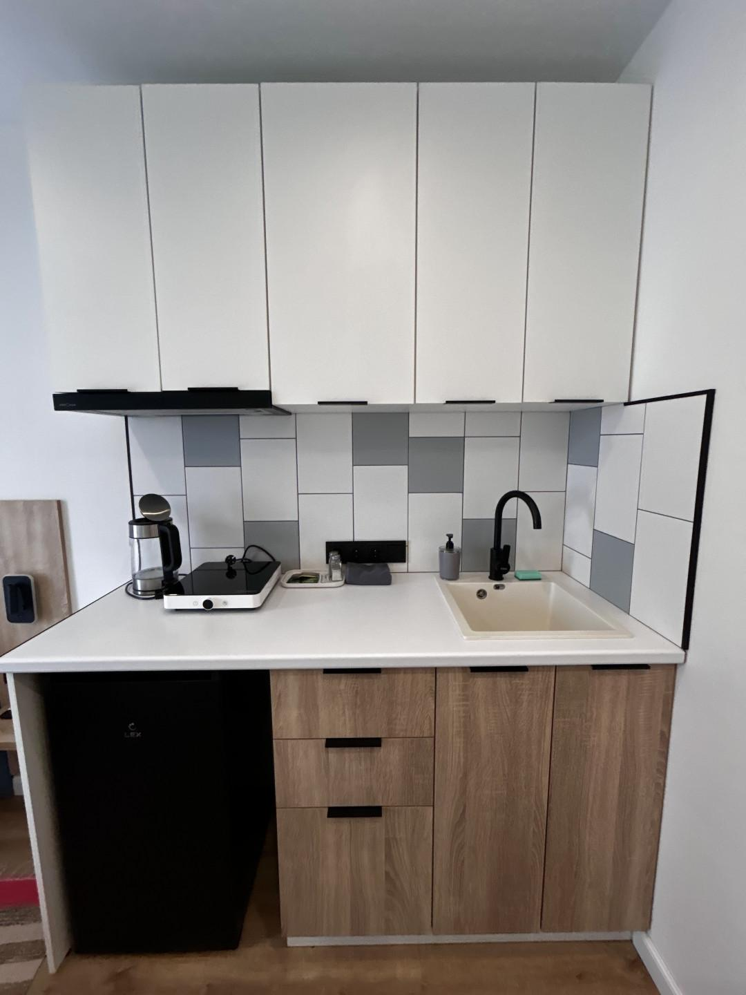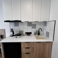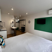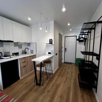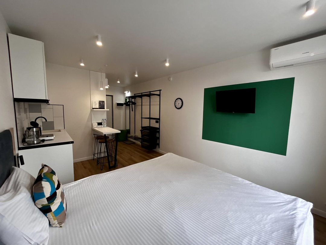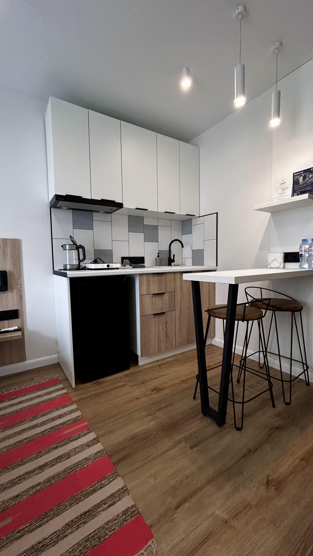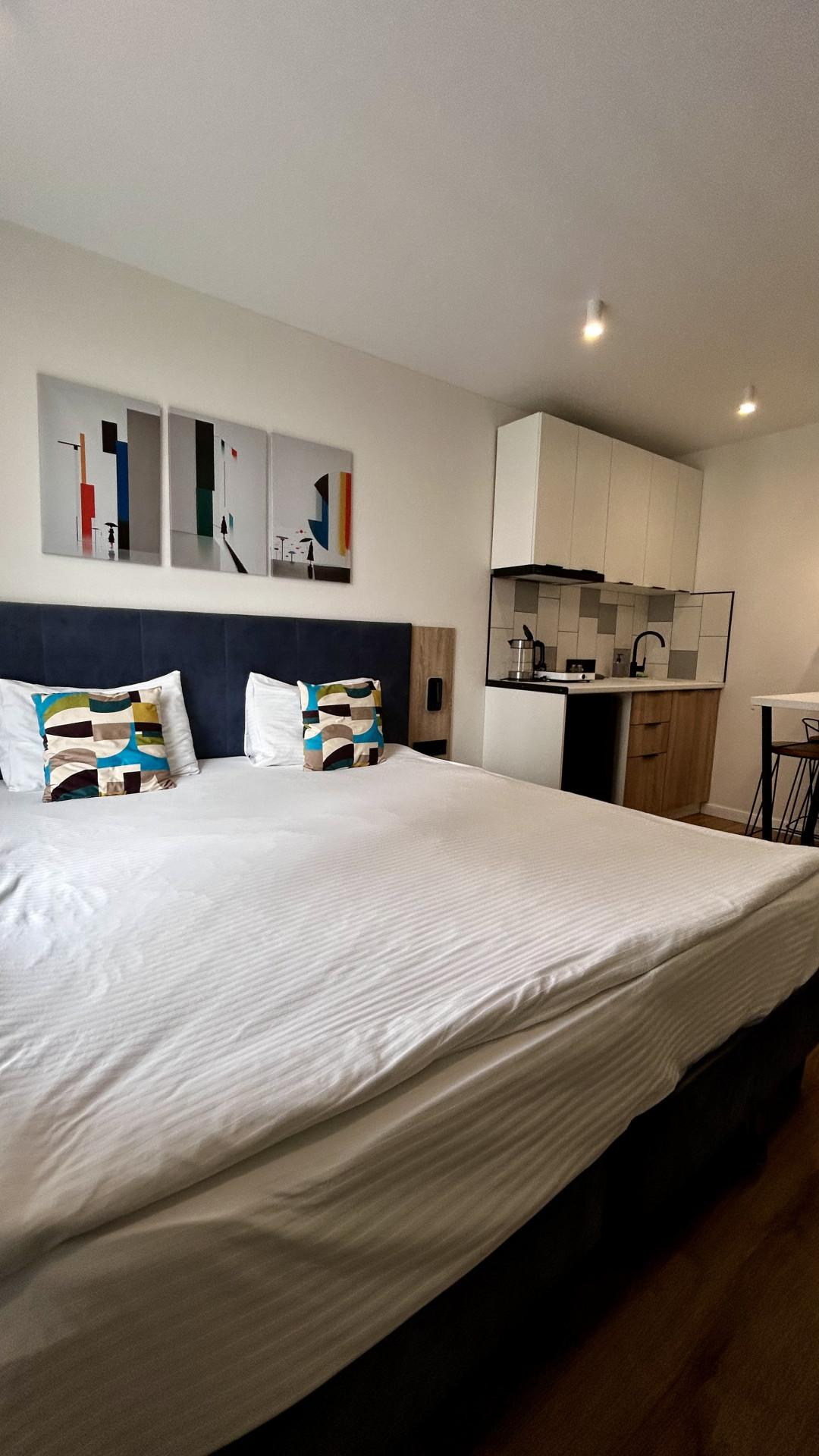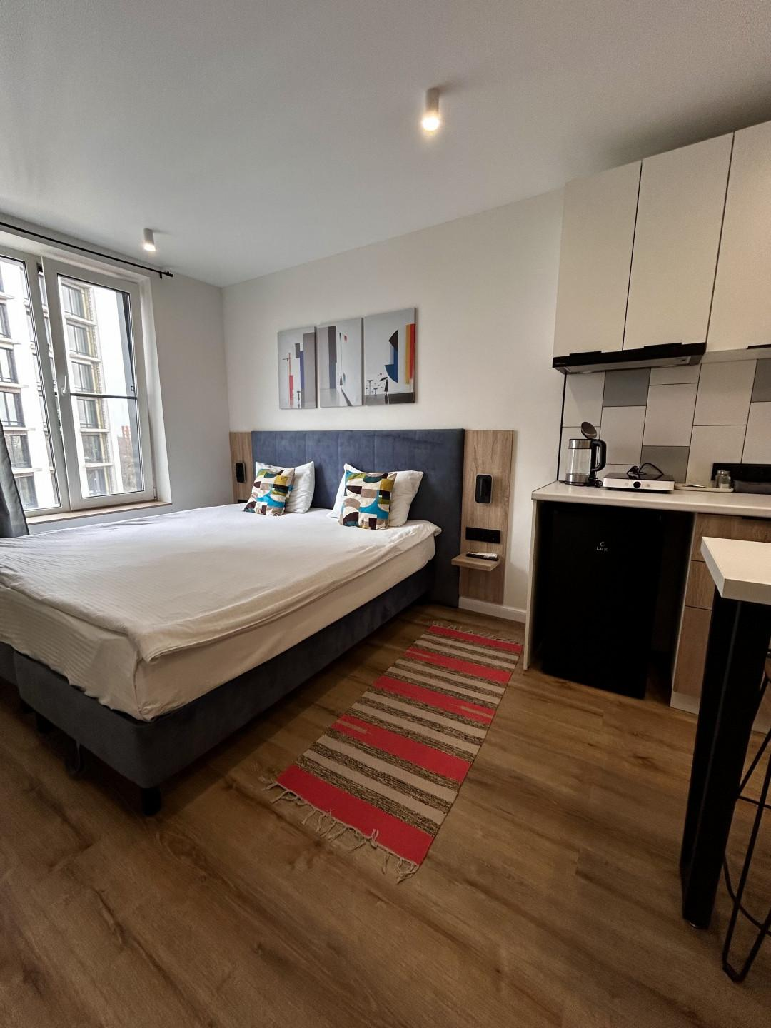 Апартаменты уже подготовлены к полноценному проживанию, сделан евроремонт. Студия полностью оборудована мебелью и техникой (кухонный гарнитур,двухспальная кровать, телевизор, кондиционер, электрическая плита, холодильник).В доме два лифта (грузовой, пассажирский), собственная парковка.(фотографии соответствуют действительности).