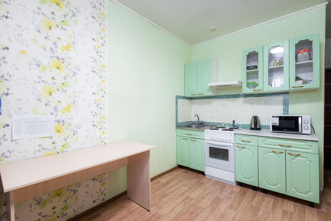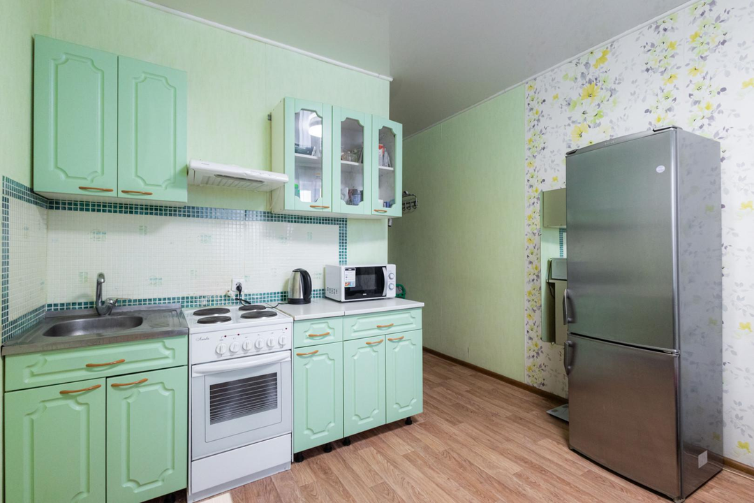 Квартира в хорошем состоянии: Светлая, с натяжными потолками, линолеумом и застекленной лоджией. На кухне и в санузле — вытяжки. В туалете — практичный кафель.