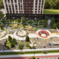 Полностью закрытая территория комплекса будет иметь собственный парк с уникальным благоустройством: 22 тематические площадки для досуга жителей разных возрастов. Центральной фигурой квартала станет фонтан, в комплексе также будет своя оранжерея, стадион, вело и беговые дорожки, спортивные и детские площадки, каток в зимнее время года.