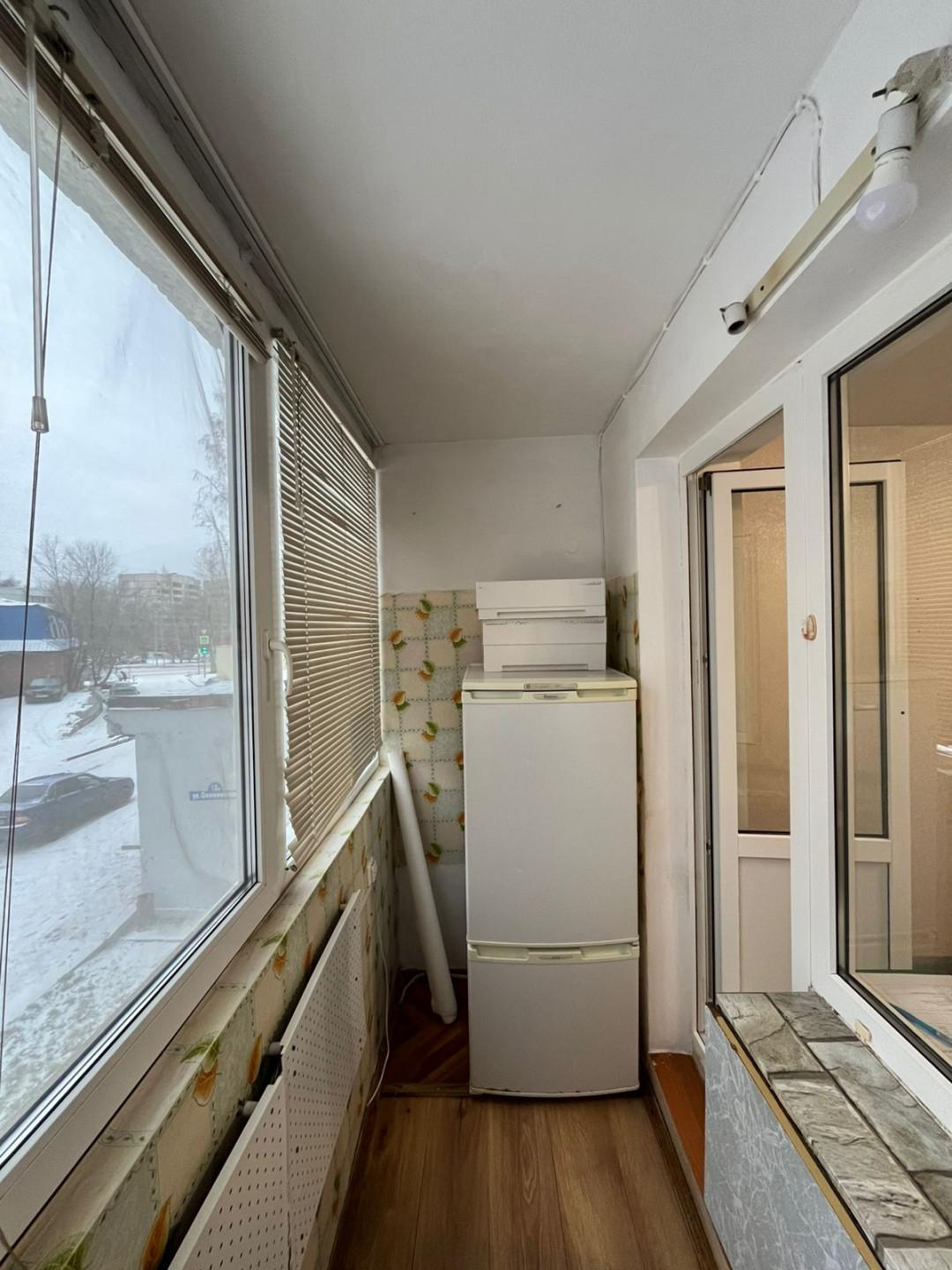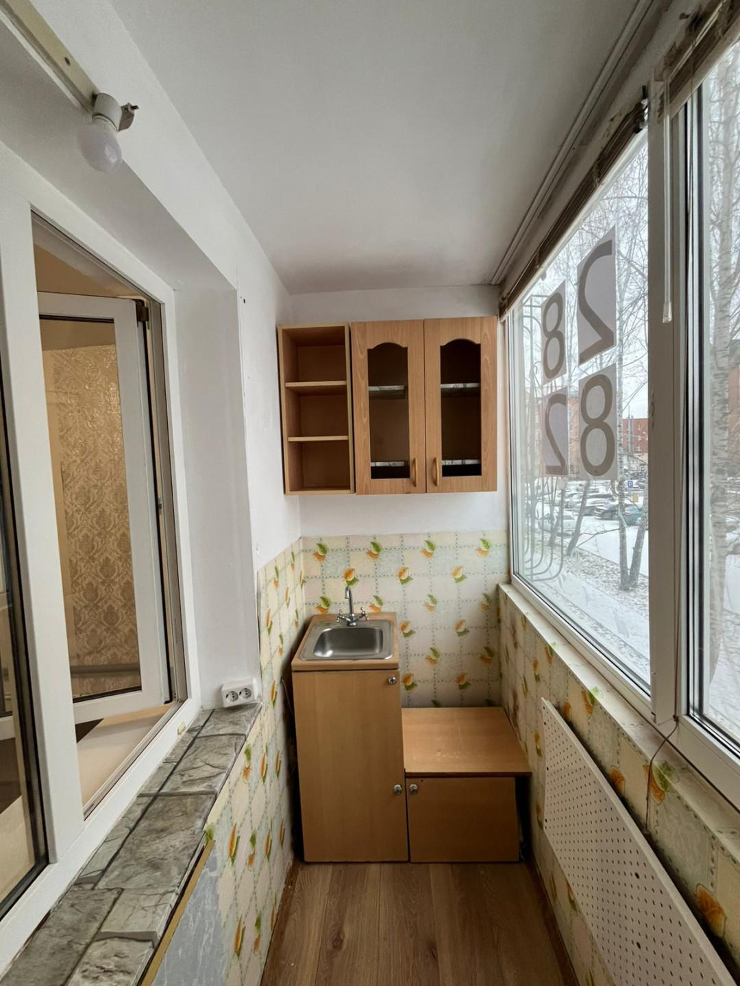 Лоджия оборудована под кухню. Пластиковые окна, отопление. В квартире остается кухонный гарнитур, раковина и холодильник.