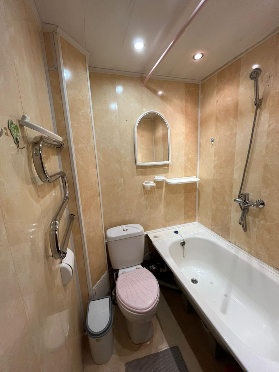 Санузел совмещенный. Стены в санузле обшиты пластиковыми панелями.