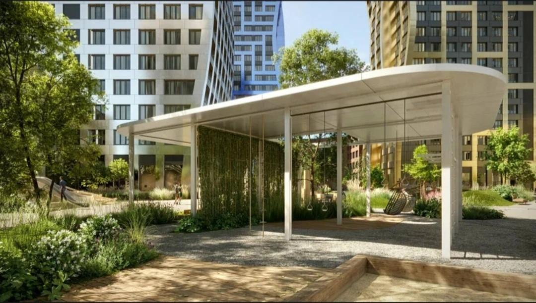 Оборудованные современные детские и спортивные площадки, открытая зона с двумя навесами, тренажерами; -Статусные входные группы; - Скоростные лифты и система безопасности; -концепция "Двор без машин"; -Собственные детский сад и школа на территории комплекса.