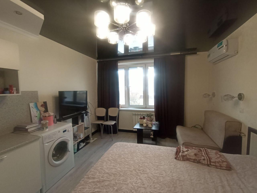 Уютные апартаменты-студия со свежим ремонтом общей площадью 22,4 м² плюс коридор 1,57м², жилая площадь – 20 м², в зоне кухни установлен теплый пол. Вид из окна на улицу со старинными особняками и на гостиницу "Ленинградская" – одну из 7 знаменитых московских высоток.