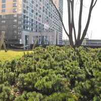 Территория комплекса тщательно благоустроена с акцентом на создание комфортной среды для всех возрастных групп. Здесь находятся детские игровые и спортивные площадки, футбольное поле, беговые дорожки, теннисный корт и места для занятия йогой. Для любителей активного отдыха предусмотрены тренажеры и воркаут зоны. Уникальность комплекса подчеркивает прилегающая лесопарковая зона и благоустроенный водоем.