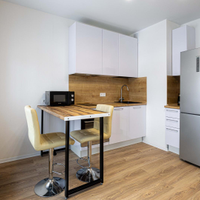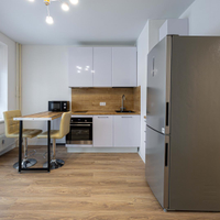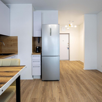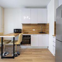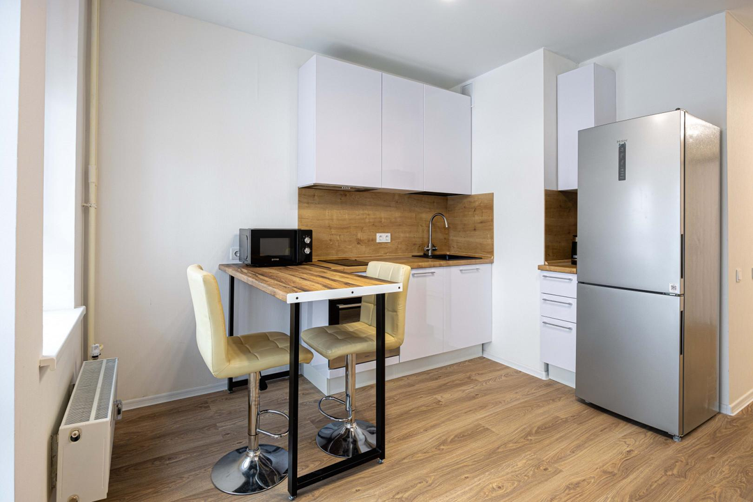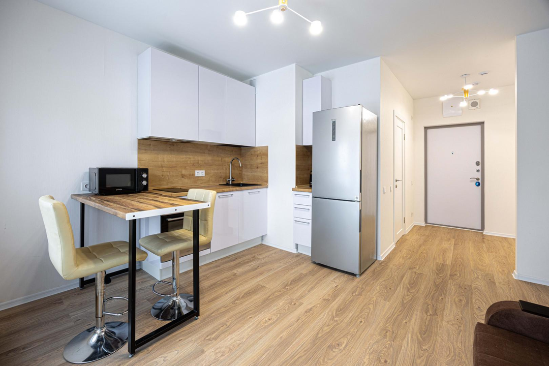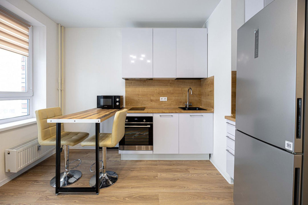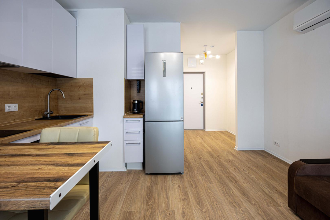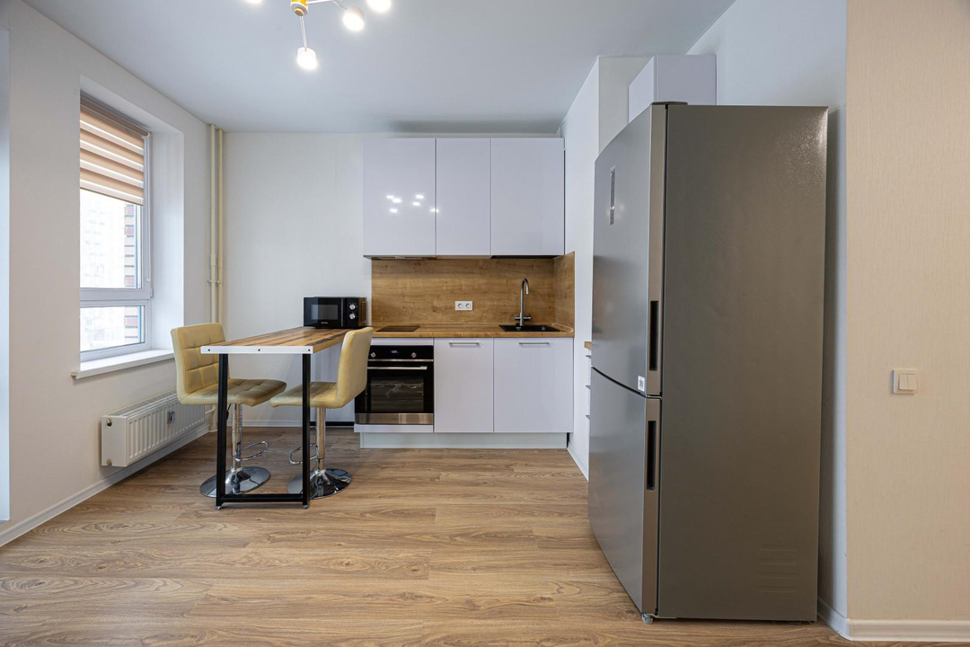 Квартира с ремонтом, кухонный гарнитур с техникой, включая посудомоичную машину.