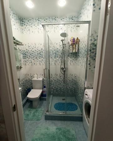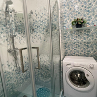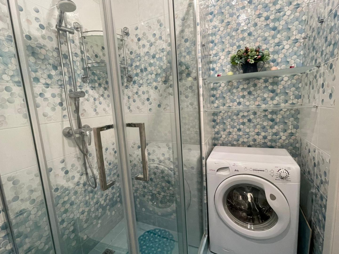 Просторный санузел. В нем установлены душевая кабинка, унитаз, раковина, зеркало, стиральная машина .