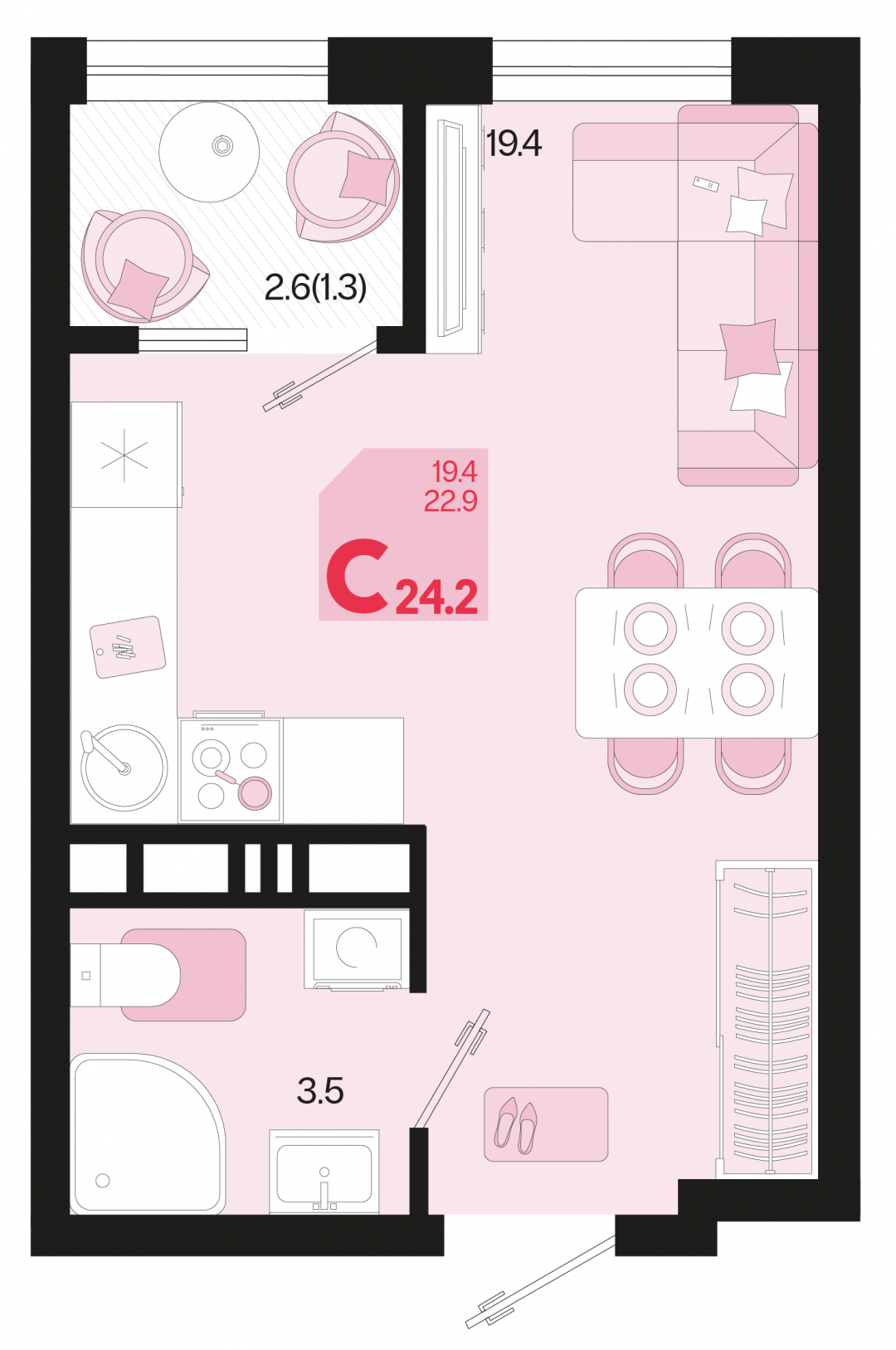 • Жилая площадь 19,4 м²