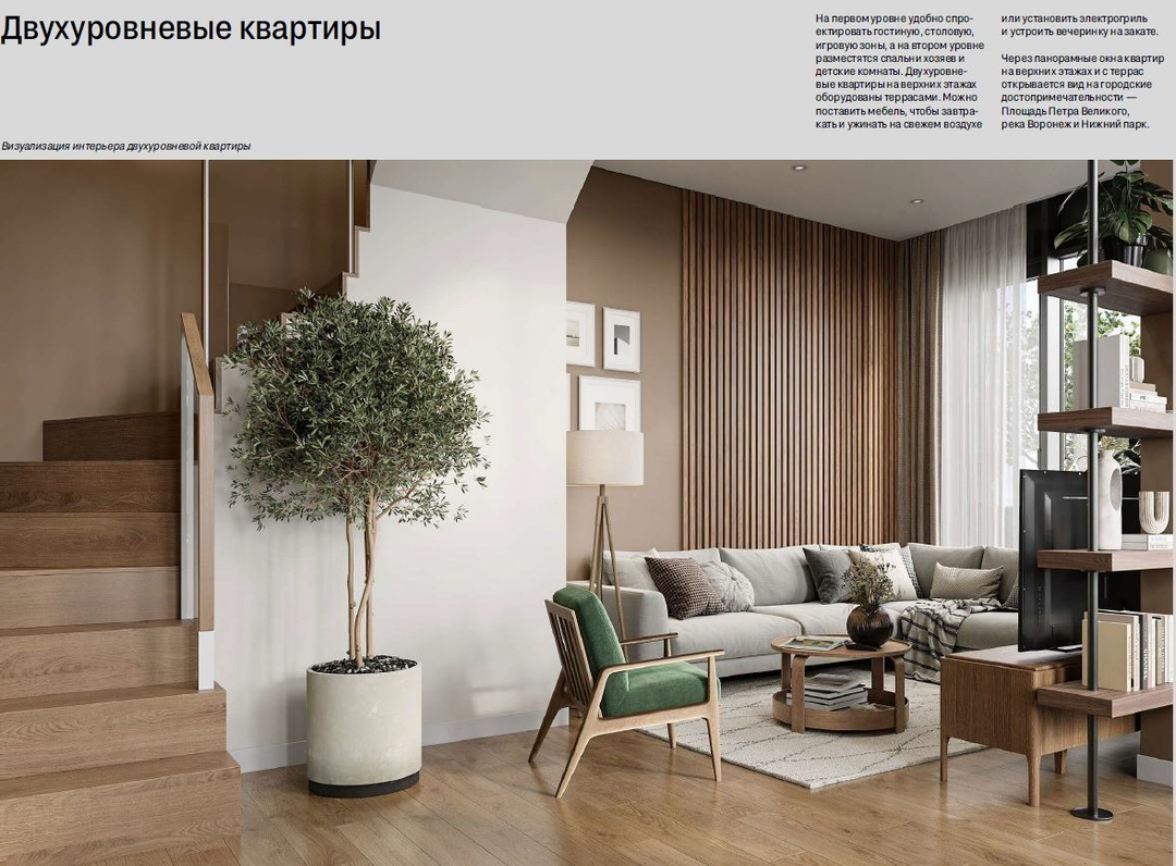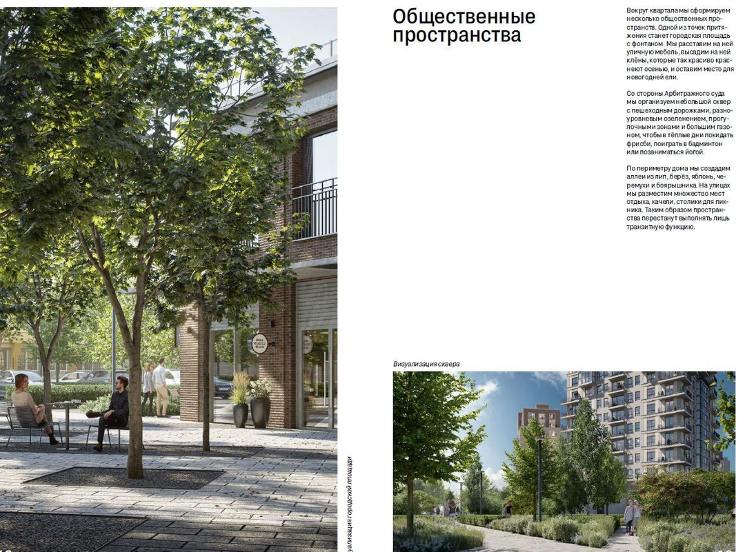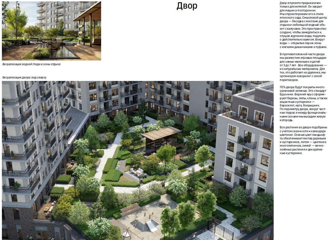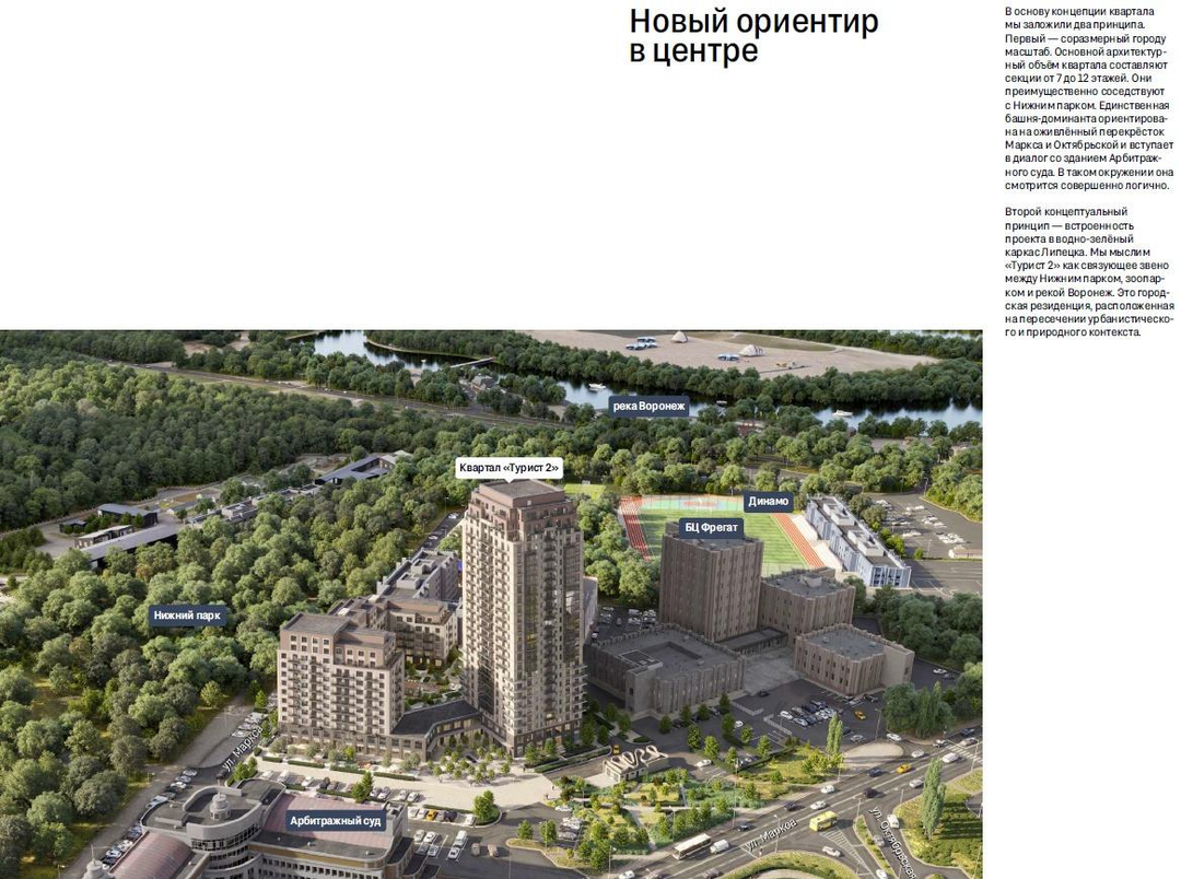 Квартал «Турист 2» расположен на границе «старого» города, рядом с любимыми местами отдыха горожан. Рядом — Нижний парк, площадь Петра Великого, стадион Динамо, а также здание Арбитражного суда Липецкой области, несколько детских садов и школа. В 150 метрах от проекта остановка общественного транспорта, через которую проходит девять автобусных маршрутов. Проект Новый ориентир в центре В основу концепции квартала мы заложили два принципа. Первый — соразмерный городу масштаб. Основной архитектурный объём квартала составляют секции от 7 до 12 этажей. Они преимущественно соседствуют с Нижним парком. Единственная башня-доминанта ориентирована на оживлённый перекрёсток Маркса и Октябрьской и вступает в диалог со зданием Арбитражного суда.В таком окружении она смотрится совершенно логично. Второй концептуальный принцип — встроенность проекта в водно-зелёный каркас Липецка, как связующее звено между Нижним парком, зоопарком и рекой Воронеж. Это городская резиденция, расположенная на пересечении урбанистического и природного контекста. Общественные пространства Вокруг квартала мы сформируем несколько общественных пространств. Одной из точек притяжения станет городская площадь с фонтаном. Мы расставим на ней уличную мебель, высадим на ней клёны, которые так красиво краснеют осенью, и оставим место для новогодней ели. Со стороны Арбитражного суда организуем небольшой сквер с пешеходным дорожками, разноуровневым озеленением, прогулочными зонами и большим газоном, чтобы в тёплые дни покидать фрисби, поиграть в бадминтон или позаниматься йогой. По периметру дома мы создадим аллеи из лип, берёз, яблонь, черемухи и боярышника. На улицах мы разместим множество мест отдыха, качели, столики для пикника. Таким образом они перестанут выполнять лишь транзитную функцию. Двор Двор в проекте предназначен только для жителей. Он закрыт для машин и посторонних. Мы спроектировали его в стиле японского сада. Смысловой центр двора — беседка с местами для отдыха и небольшой водный объект с валунами. Это пространство создано, чтобы замедлиться и, слушая журчание воды, подумать о действительно важном. Вокруг воды — открытые лаунж-зоны с мягкими диванчиками и пуфами. В противоположной части двора мы разместим игровые площадки для самых маленьких и детей от 3 до 7 лет. Все оборудование — из натуральных материалов. Для тех, кто работает на удаленке, мы организуем коворкинг с зоной переговоров. 70% двора будут покрыты многоуровневой зеленью. Это стандарт Брусники. Верхний ярус сформируют березы, липы, клены, а также акцентные кустарники — бересклет, ирга, боярышник. По периметру двора, вокруг частных террас и между функциональными зонами мы высадим живую изгородь. Все растения во дворе подобраны с учётом сезонности и календаря цветения. Осенью цвет ландшафта обеспечивает листва деревьев и кустарников, летом 一 цветение многолетников, зимой 一 вечнозелёные растения и декоративные кустарники. Лобби и гостиные в подъездах Особенностью проекта станет двухуровневое центральное лобби со вторым светом. Внутренние пространства поддержат визуальную концепцию экстерьера: высокие потолки и прямые линии, благородные цветовые решения с использованием природных материалов — дерева и керамогранита. Они износостойкие, визуально привлекательные и приятные 