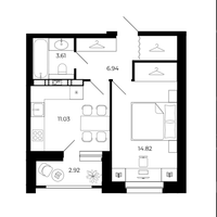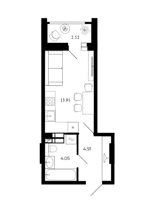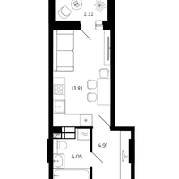 Студия 24.79 м² с выходом на лоджию площадью 2.52 м², с совмещенным санузлом и просторным коридором и местом для хранения.