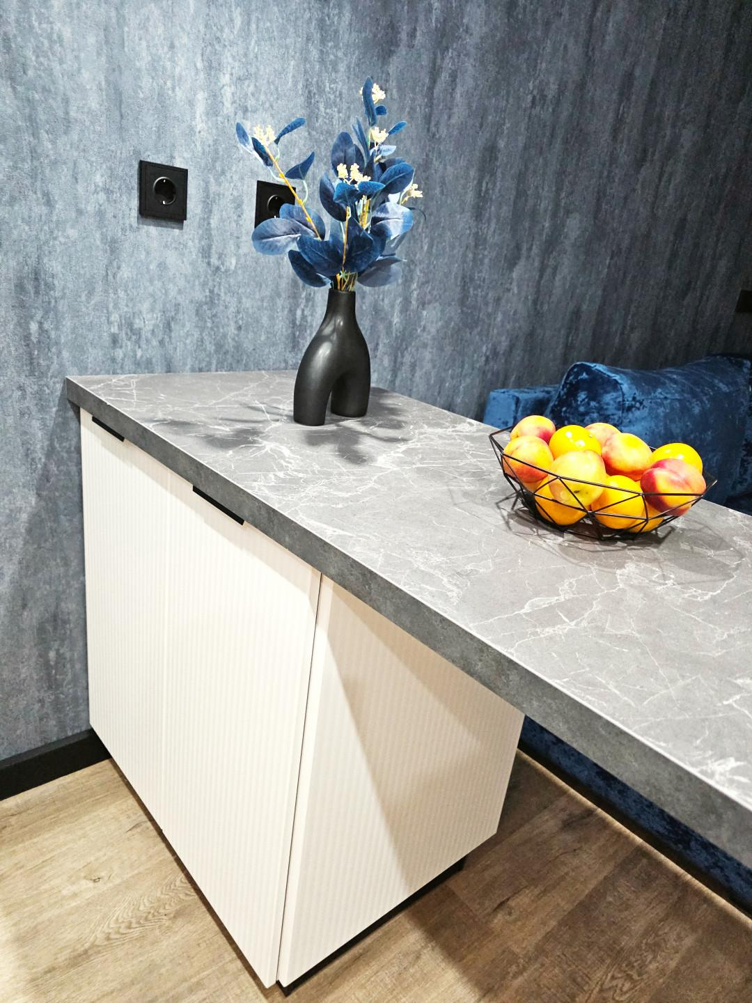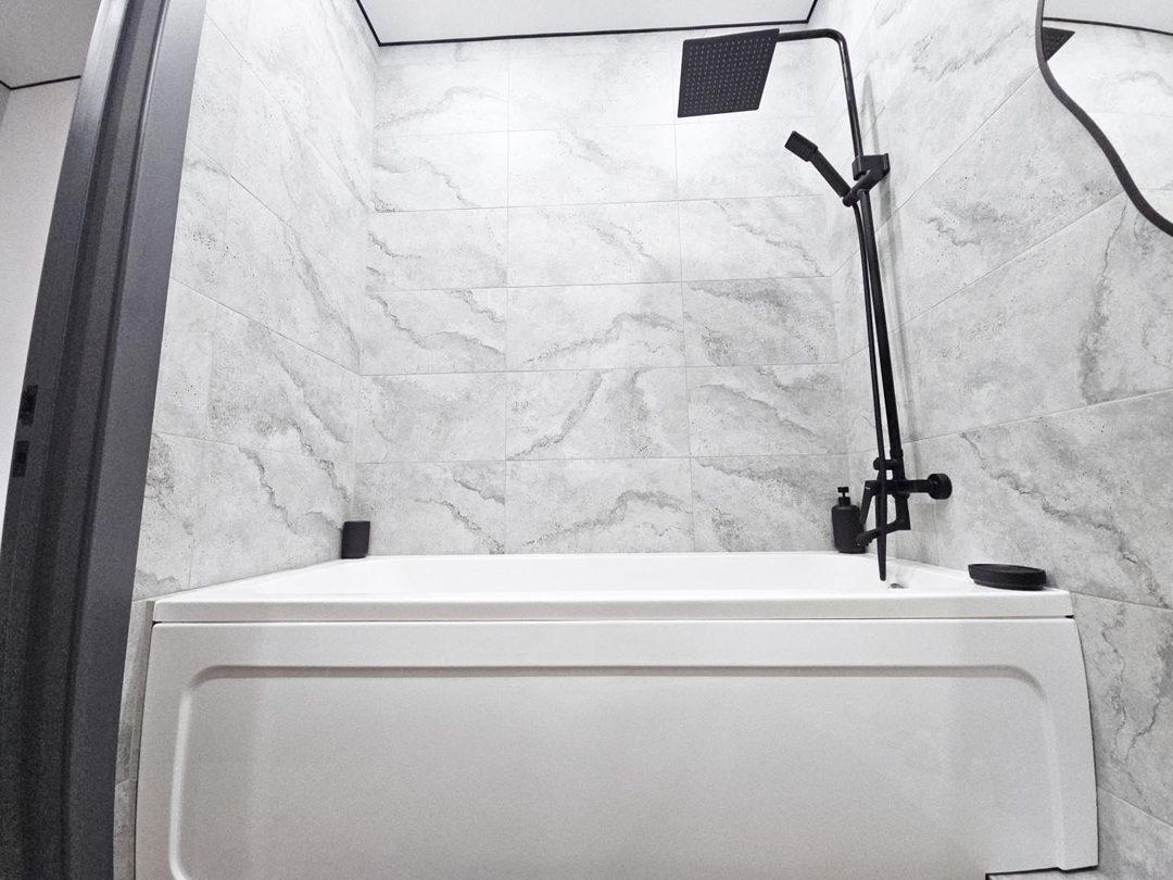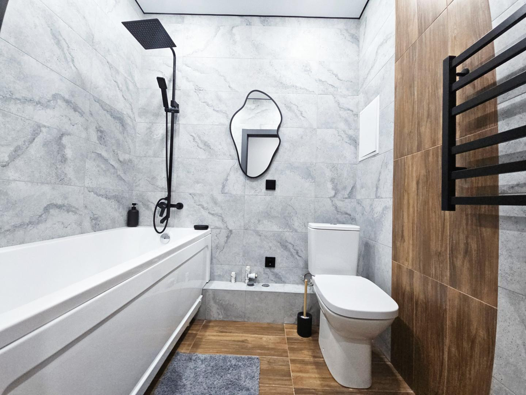 Пол из замкового кварцвинила – это не просто стильное решение, это гарантия долговечности и практичности. Он не боится влаги, перепадов температур и времени. Он не дает усадку, не образует сколов, его очень сложно повредить мебелью, а стулья не издают резких звуков при передвигании к столу по такому полу. Ванная комната, полностью облицованная заказным керамогранитом из Керамомира, станет вашим личным SPA-салоном. А балкон с фактурной декоративной штукатуркой и новым стеклопакетом – идеальным местом для утреннего кофе или вечернего отдыха.