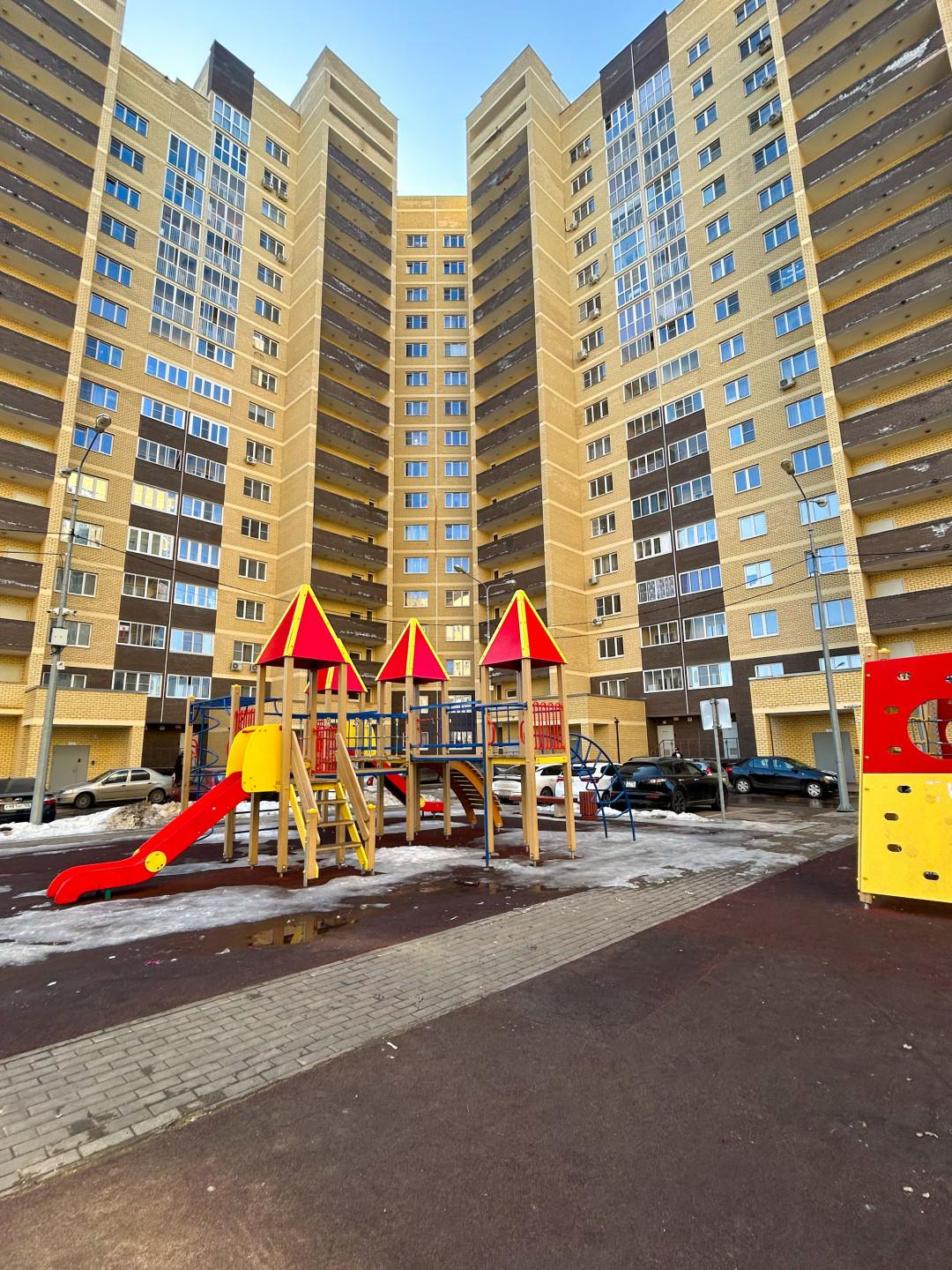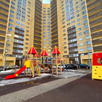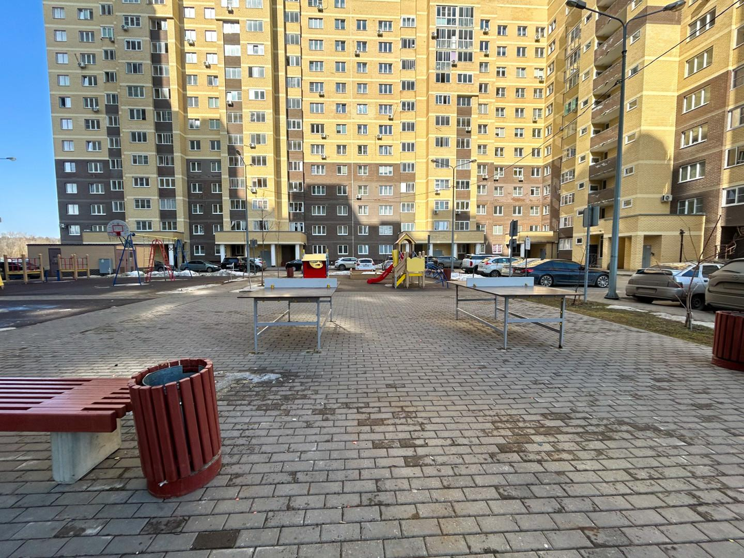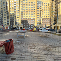 -Во дворе большая детская площадка, оборудованная различными качелями, горками и столами для игры в настольный теннис.