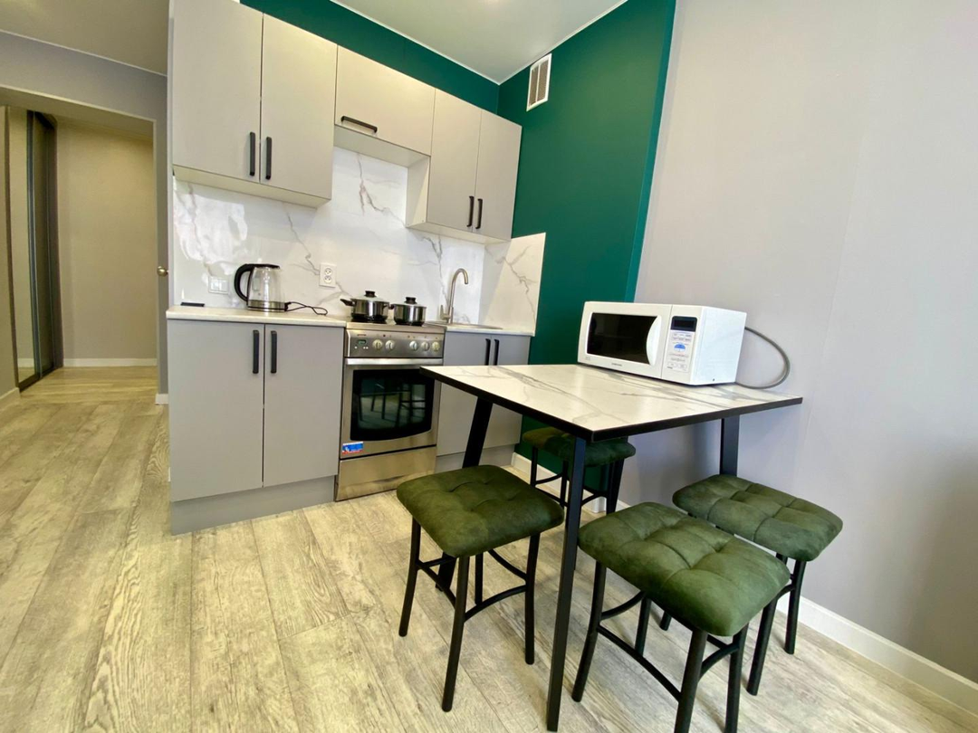 -Современный ремонт: Свежий евроремонт с натяжными потолками и новым линолеумом.