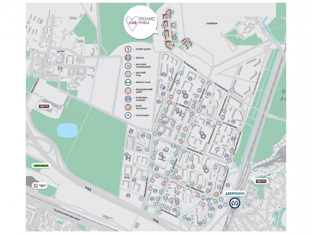 Жилой квартал объединяет 6 домов, детский сад и школу! Дворы оборудованы пространством для спорта и отдыха. Во дворах расположены игровые площадки для детей разных возрастов, площадки для воркаута и командных игр.На первом этаже разместились коммерческие помещения. Рядом с ЖК расположен многоуровневый паркинг.Ближайшая станция метро - Девяткино, железнодорожная станция Лаврики.Удачная локация позволяет быстро добраться до исторического центра города, и в места загородного отдыха - Охта парк, Северный склон, Зубровник, озеро Хепоярви.